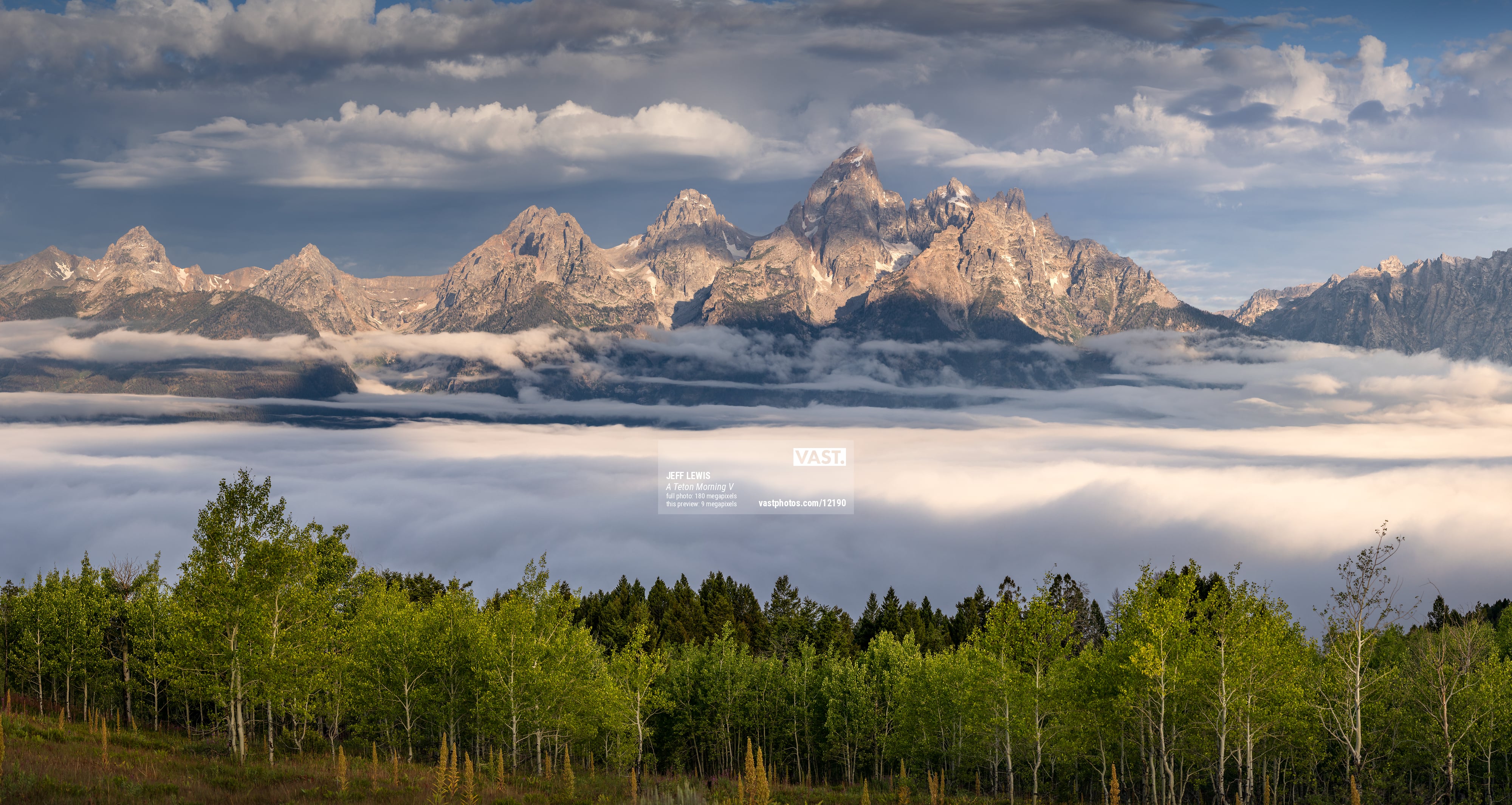 The scene was incredibly dynamic, with clouds drifting over the peaks and the fog changing colors. Thanks to the clear mountain air and sweeping views, I was able to capture five VAST photos over the course of a few hours, before heading back down the hill into the fog to start a 15-mile hike, which was also lovely! Over this trip, I hiked around 80 miles, which included a summit of Middle Teton, the second highest peak in the range and prominently visible in the center of this VAST photo. It was a long day, but one of the most rewarding summits I've stood on, and it made the photos from the trip much more special. I hope you're able to enjoy it as well!
