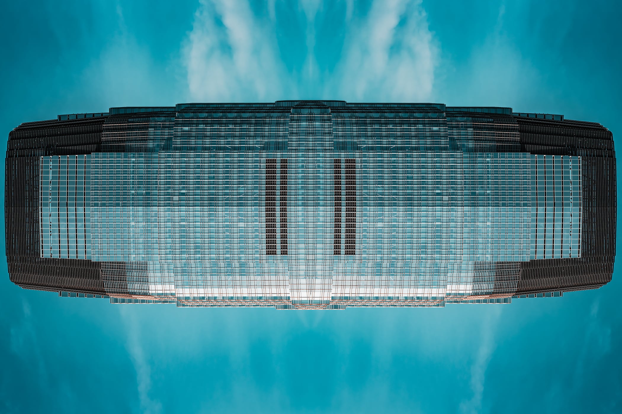 In this captivating architectural abstract, the mirrored composition transforms a modern building into an almost alien spacecraft hovering in a pristine teal sky. The precision of the horizontal and vertical lines creates a hypnotic grid that conveys both complexity and harmony. The symmetrical framing enhances the illusion, giving the structure a surreal, futuristic quality—its form reminiscent of a massive vessel or high-tech monolith. Subtle reflections and a soft gradient in the sky deepen the image’s visual impact, making it not just a photograph but a piece of conceptual art that challenges the viewer’s perception of space, structure, and design.