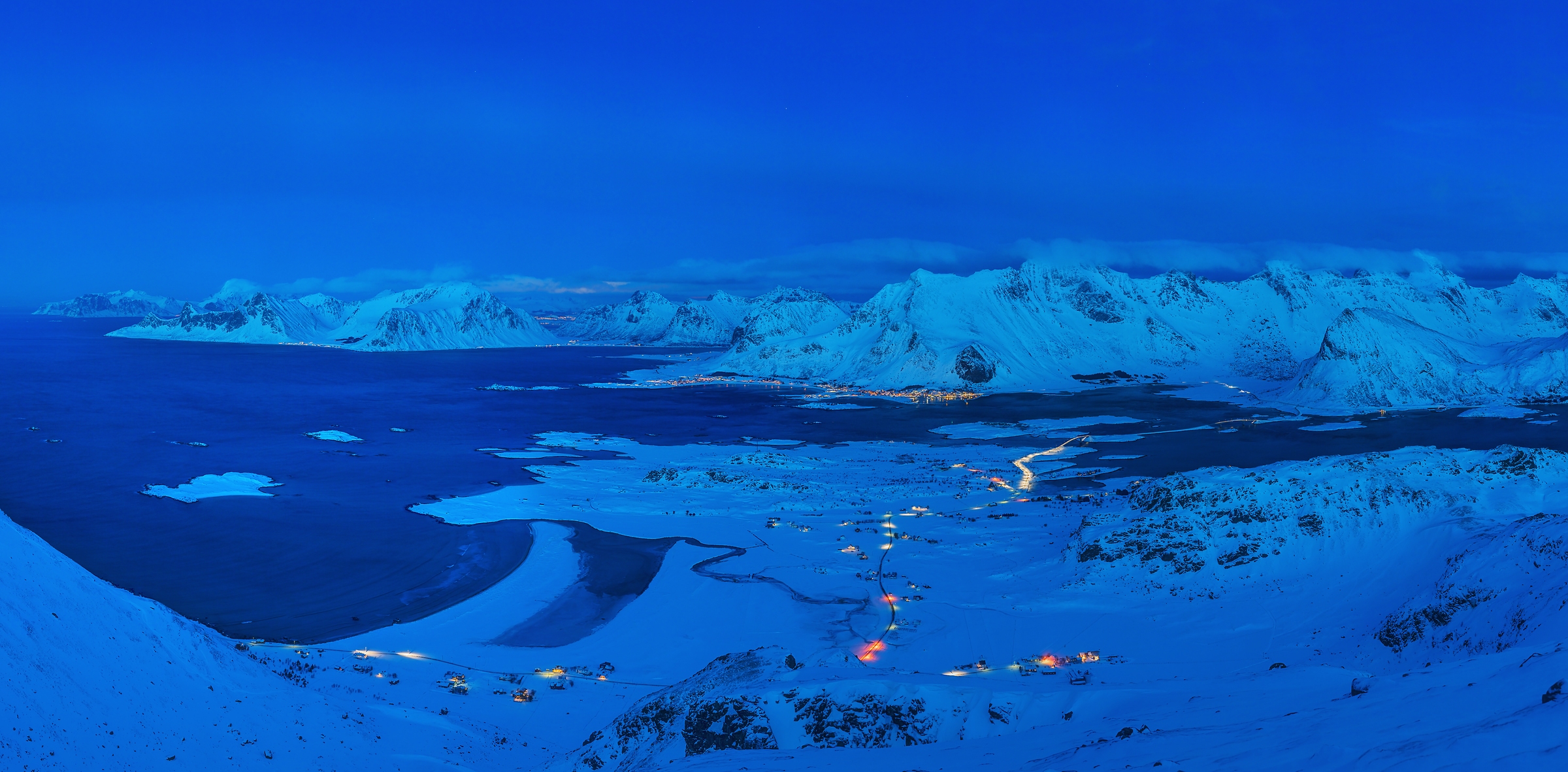 The weather in the Arctic can be very tough, with long periods of waiting indoors. That's why I like to spend about 6 weeks each winter in Lofoten with my friends. It's a great way to pass the time while waiting for better weather. Ryten is a popular mountain that I like to hike. It's not too difficult and takes about 2 hours to reach the summit in snowshoes. The view from the top is my favorite. You can see the bridges connecting Flakstadøya and Moskenesøya islands. It can get quite cold and windy up here, but as a photographer, I know that sometimes you have to suffer a little bit to get a great shot.