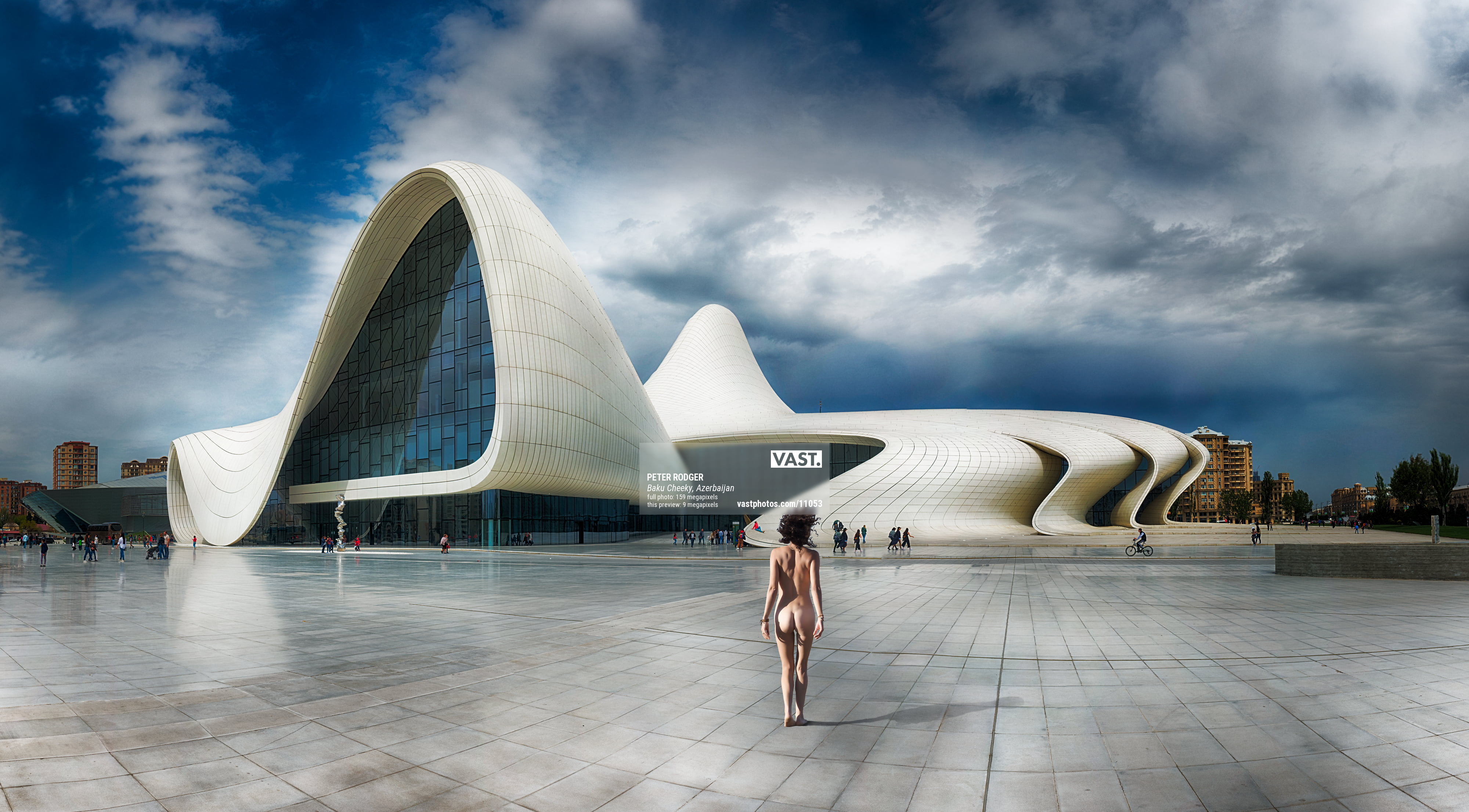 159 megapixels! A very high resolution, large-format VAST photo print of a nude woman in a plaza in front of a modern building; surreal nude photograph created by Peter Rodger in Heydar Aliyev Center, Baku, Azerbaijan.
