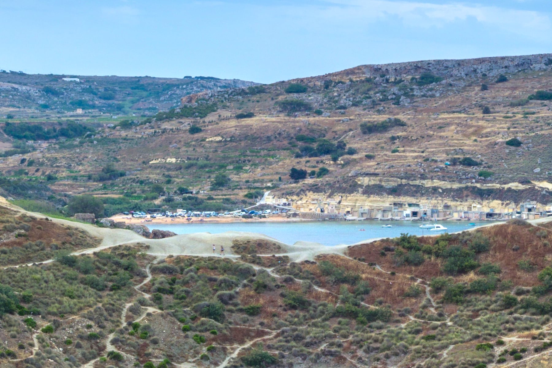 This stunning panoramic image captures the tranquil beauty of Ghajn Tuffieha Bay in Malta. Nestled between rolling hills and dramatic cliffs, the bay's crystal-clear turquoise waters gently lap against the sandy shoreline. The image reveals the natural harmony between land and sea, with lush vegetation, rugged rock formations, and anchored boats peacefully floating in the sheltered bay. The gentle gradient of blue in the water contrasts beautifully with the earthy tones of the cliffs and the soft pastel hues of the sky, creating a serene and captivating landscape.