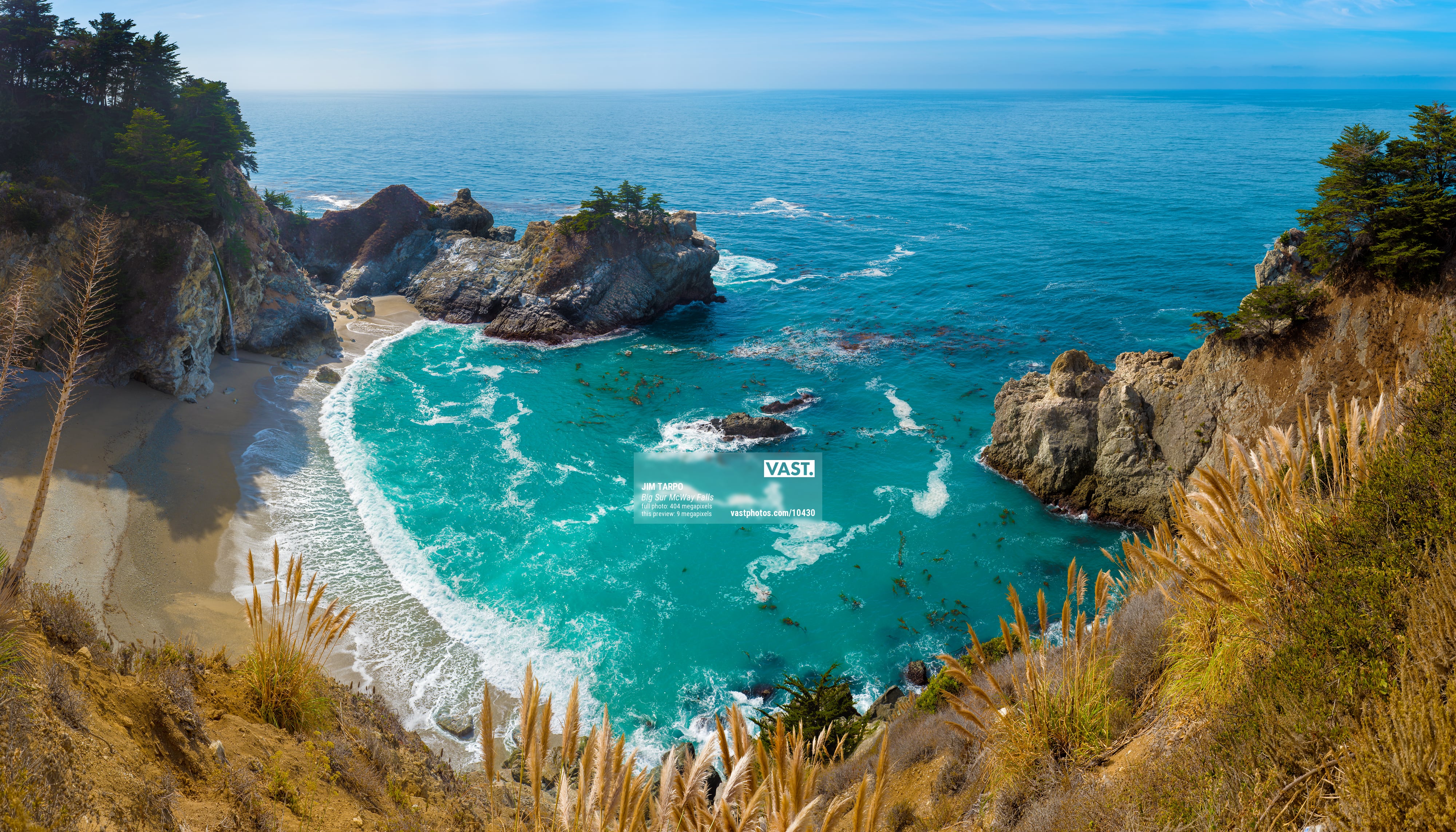This vantage of McWay Falls in Big Sur places the viewer in very close proximity to the beautiful cove and waterfall in a way that most images of this iconic location do not. The exquisite aqua-colored water that crests in a beautiful foam lined wave upon the shore is intensified by the abundant late-morning sunlight.