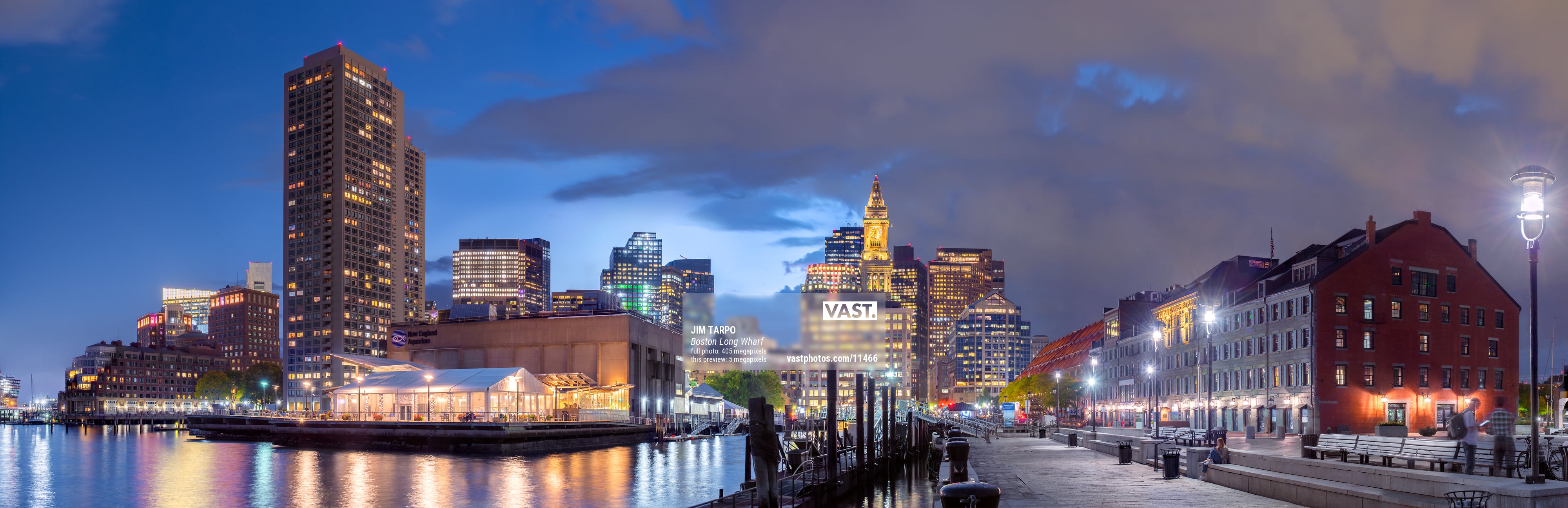 405 megapixels! A very high resolution, large-format VAST photo print of Long Wharf in Boston with the city skyline in the background; photograph created by Jim Tarpo in Boston, Massachusetts.