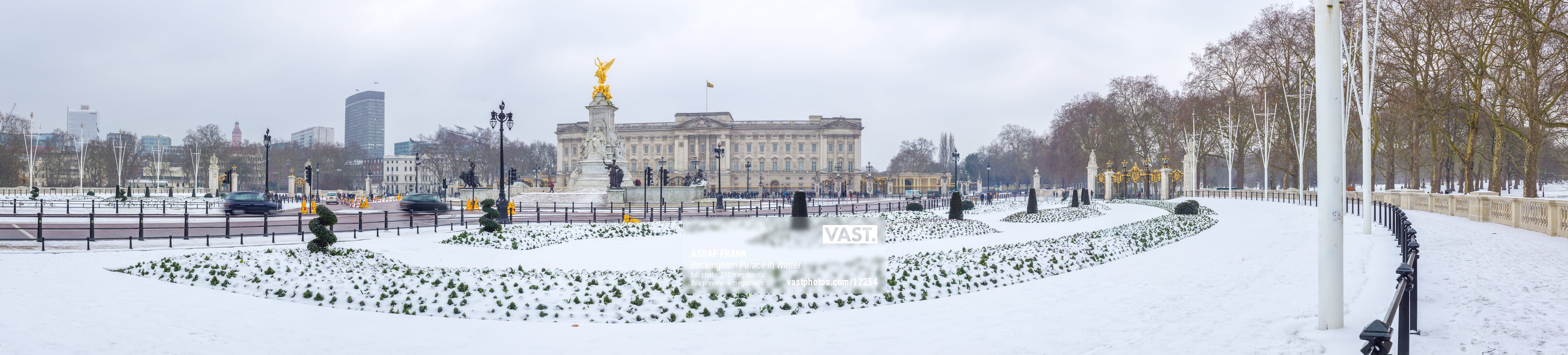 This enchanting panoramic photograph captures Buckingham Palace in the heart of London, adorned by a serene winter blanket of snow. The image beautifully showcases the grandeur of the royal residence, with its neoclassical architecture standing proudly against the soft, overcast sky. In the foreground, the Victoria Memorial, gilded in gold, adds a striking contrast to the muted tones of the snowy landscape. The normally bustling area appears calm and peaceful, offering a rare and magical glimpse of the palace grounds transformed into a winter wonderland.