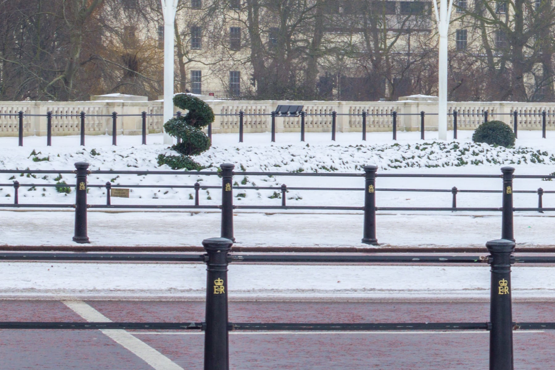 Encircling the palace are snow-covered trees and neatly manicured gardens, their symmetry and order enhanced by the white coating. The black iron railings and lamp posts add a timeless elegance to the scene. Sparse foot traffic and light vehicular movement suggest a tranquil day, allowing the viewer to fully appreciate the beauty and serenity of this iconic British landmark during wintertime. The overall ambience evokes a sense of regal stillness, a moment frozen in time amid the hustle of London life.