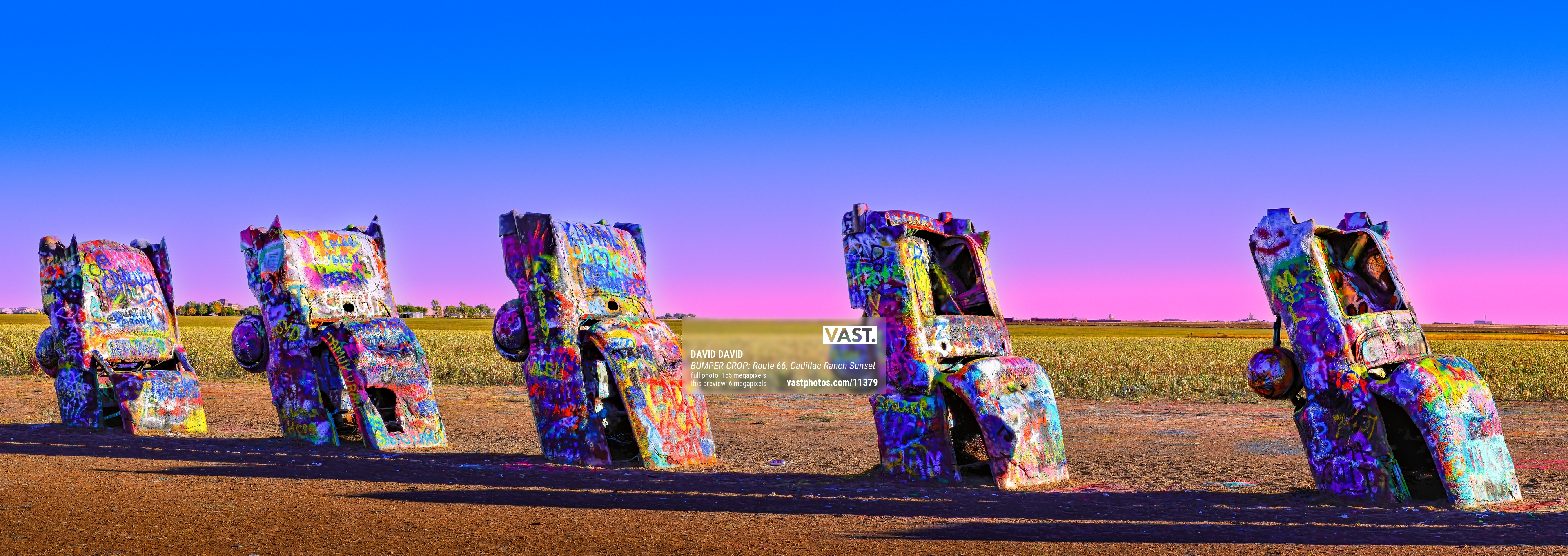 Created in 1974, today Cadillac Ranch is a must-see attraction along this stretch of Route 66. And if you’re at all a car buff, the piece “Bumper Crop” is a must-own Ultra High-Resolution Image perfect for your cave, garage, or anywhere you happen to park your classic car.
