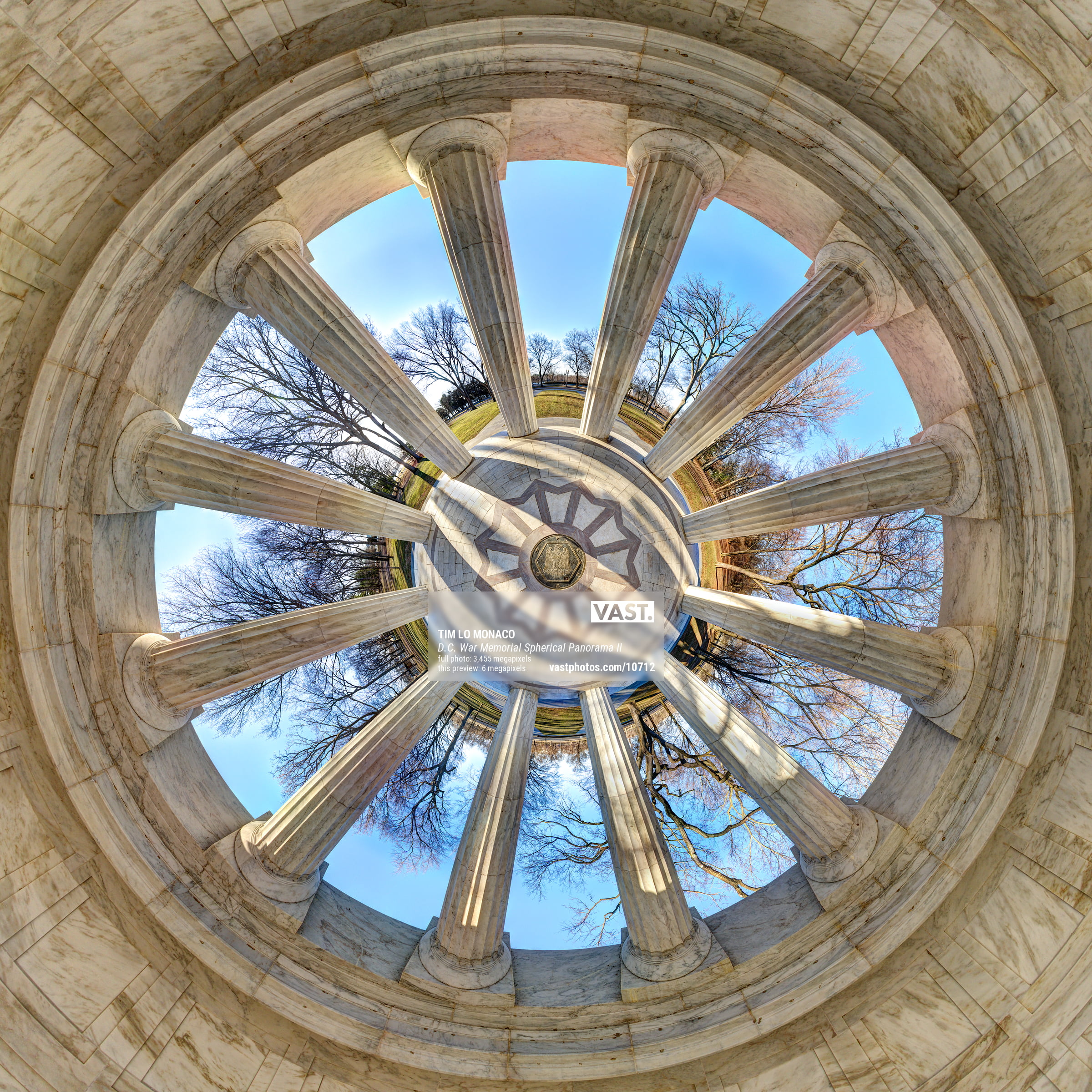 I chose the seal in the center of the floor as my center-point in this version as the symmetrical monument bends into this fascinating perspective. I didn’t shoot this panorama until two years after my first. In 2013 I hadn’t yet figured out the trick of taking the “nadir photo” (the point vertically beneath the camera center at the time of exposure) while producing the seamless result seen here.