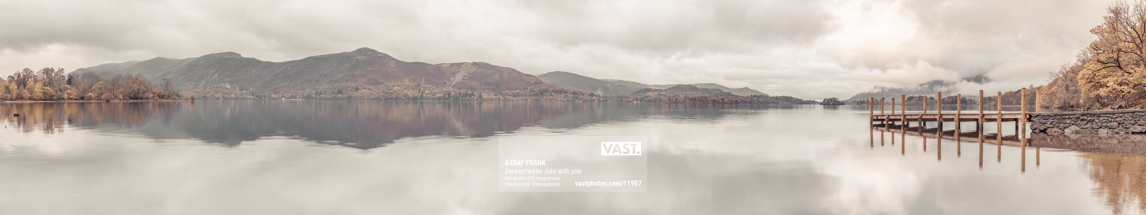 This panoramic image encapsulates the serene beauty of Derwentwater Lake, featuring a peaceful pier extending into the calm waters. The glassy surface of the lake mirrors the surrounding mountains and clouds, creating a mesmerising reflection that adds to the tranquil ambience of the scene. The muted, sepia-like tones evoke a timeless feel, perfectly complementing the natural beauty of the Lake District. This untouched landscape offers a moment of quiet reflection as the stillness of the water contrasts with the rugged, undulating hills in the background.