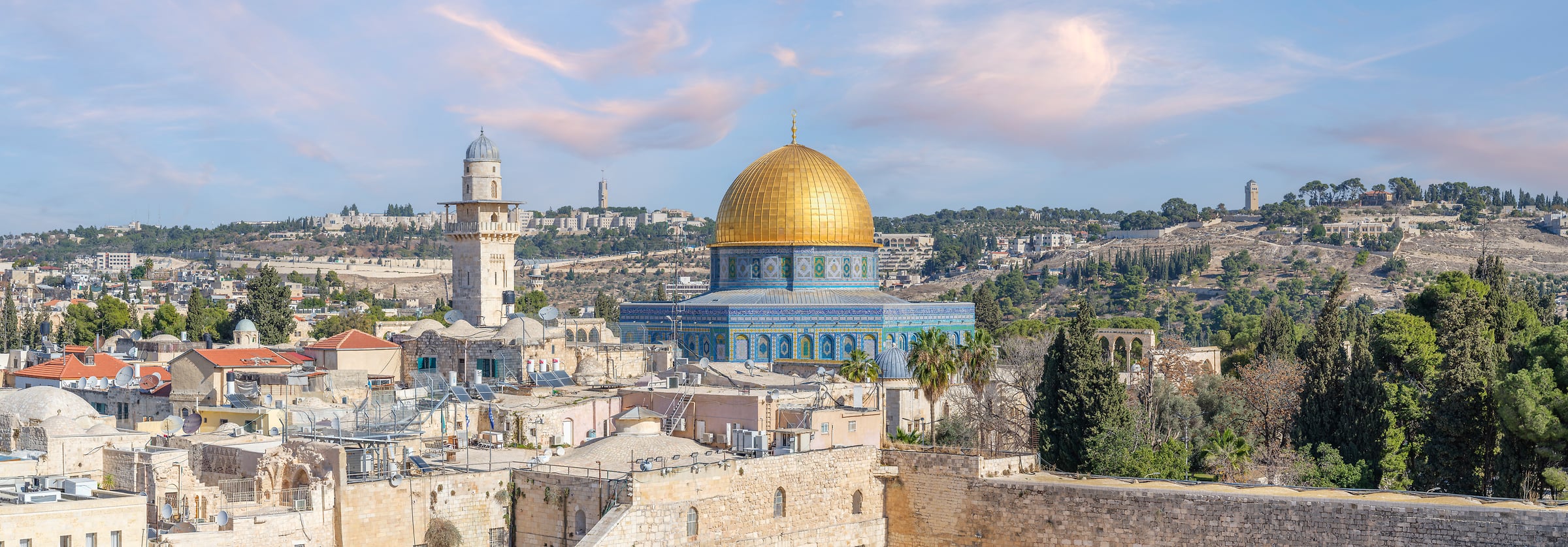 The photograph of the Dome of the Rock in Jerusalem is a stunning representation of historical grandeur and religious significance, captured with a keen eye for detail and composition. The Dome of the Rock, with its resplendent golden dome, stands as the centrepiece of this panoramic image, drawing the viewer's attention immediately. Its vibrant hue contrasts beautifully with the soft pastel colors of the sky, delicately painted with light pink and blue tones, creating a serene and peaceful atmosphere.