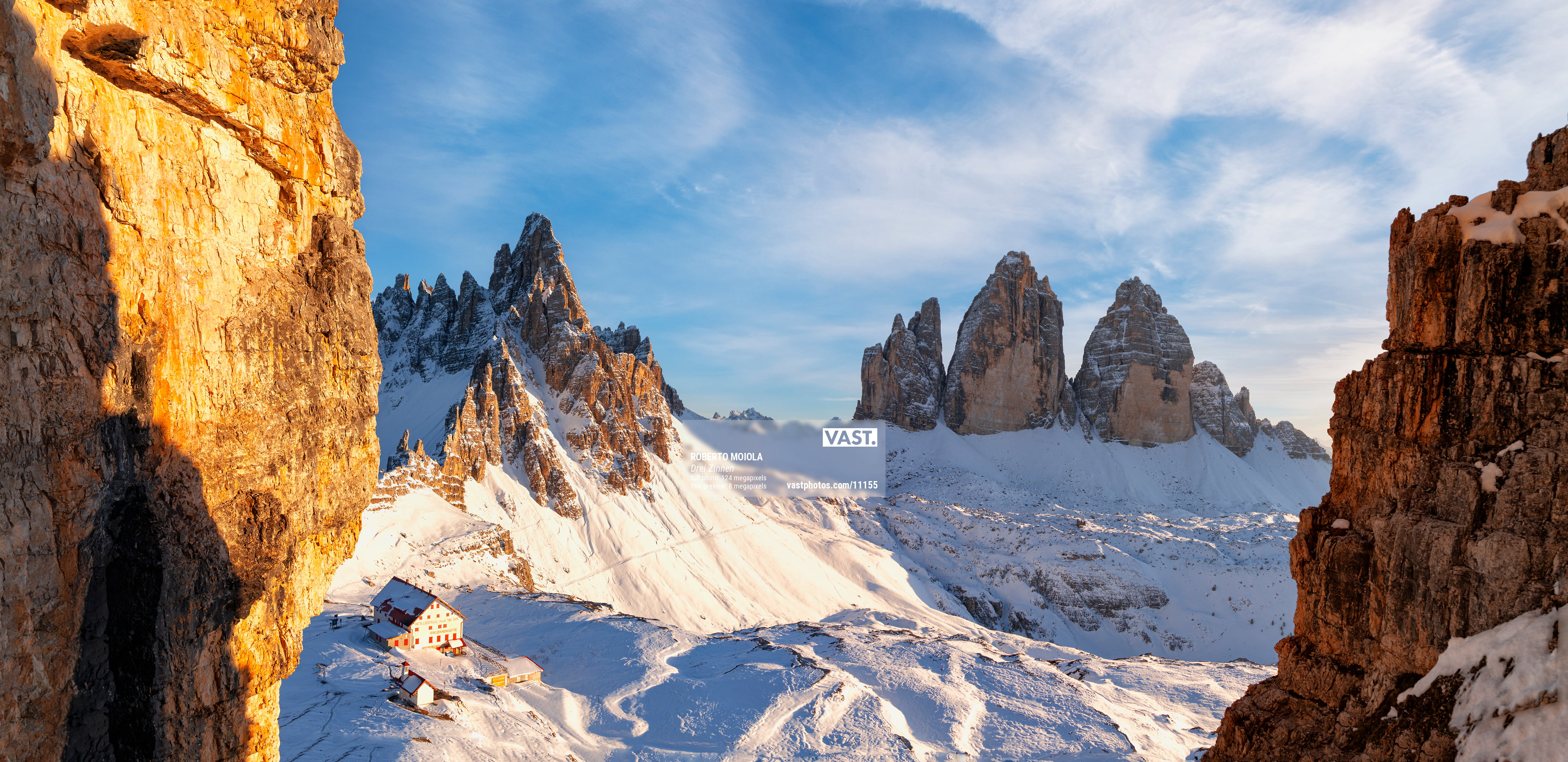 The first snow and the autumn sunset give us an image of great landscape impact, thanks to the imposing towers and the traditional mountain hut Locatelli, an icon and strategic point for hikers and mountaineers.