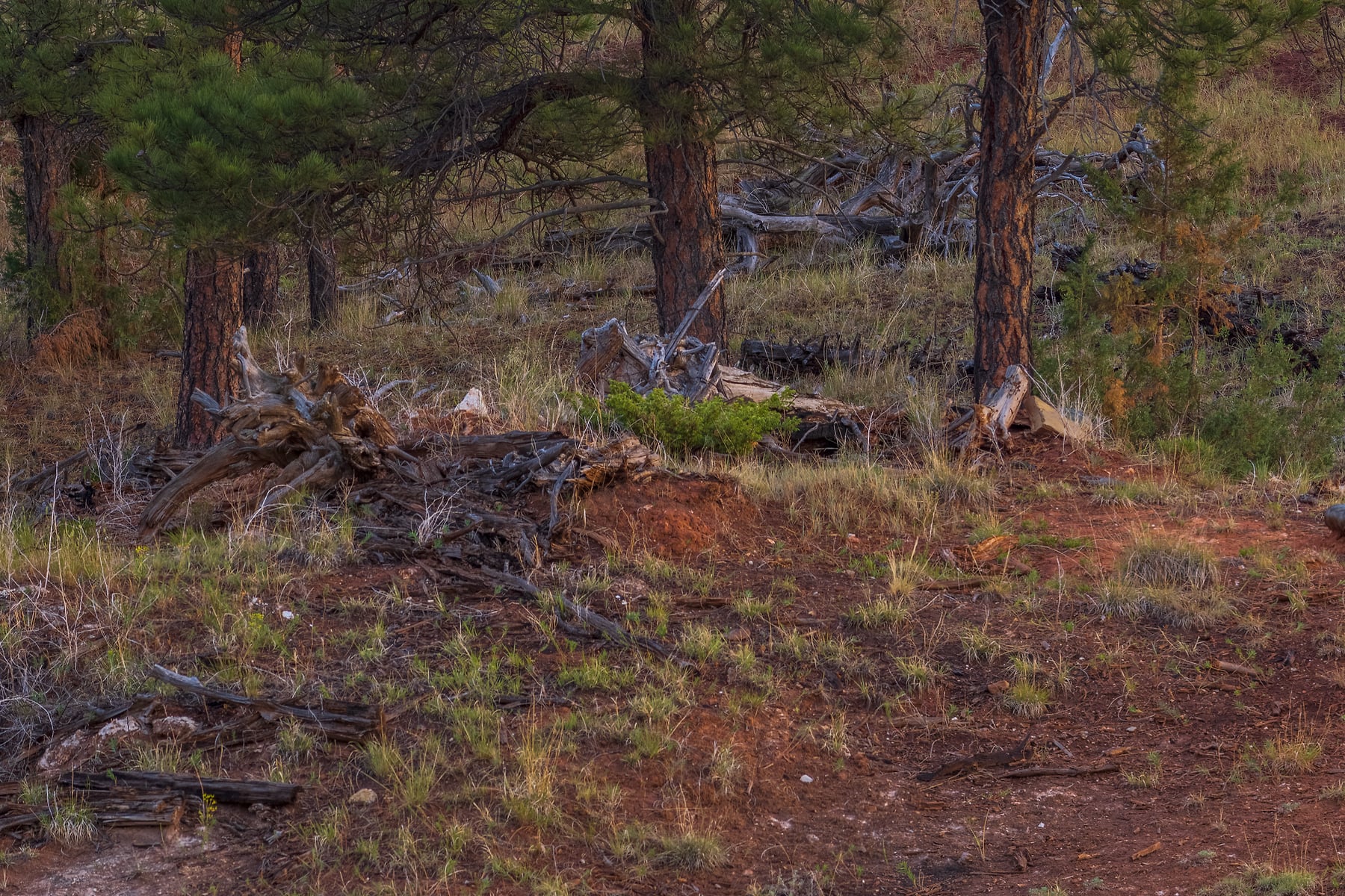 June 27, 2021, 5:15am. -- I was up early to allow me time to drive to the location I had spotted the day before. I arrived about 4:45am just as the first light was showing on the horizon so I quickly hiked to this location and sat up my rig. As the first light began to illuminate the clouds I could see that it was going to be a glorious sunrise. With all the trees in the foreground I needed to do a focus stacked panorama so I setup my camera to do focus bracketing. I waited until the Alpen Glow was illuminating the tower and started shooting. As I was shooting, the pinks and reds of the early light exploded. The smoother areas of the tower reflect the light. The grass in the lower right has began to ripen providing some golden tones while the red earth compliments the green of the pine trees.