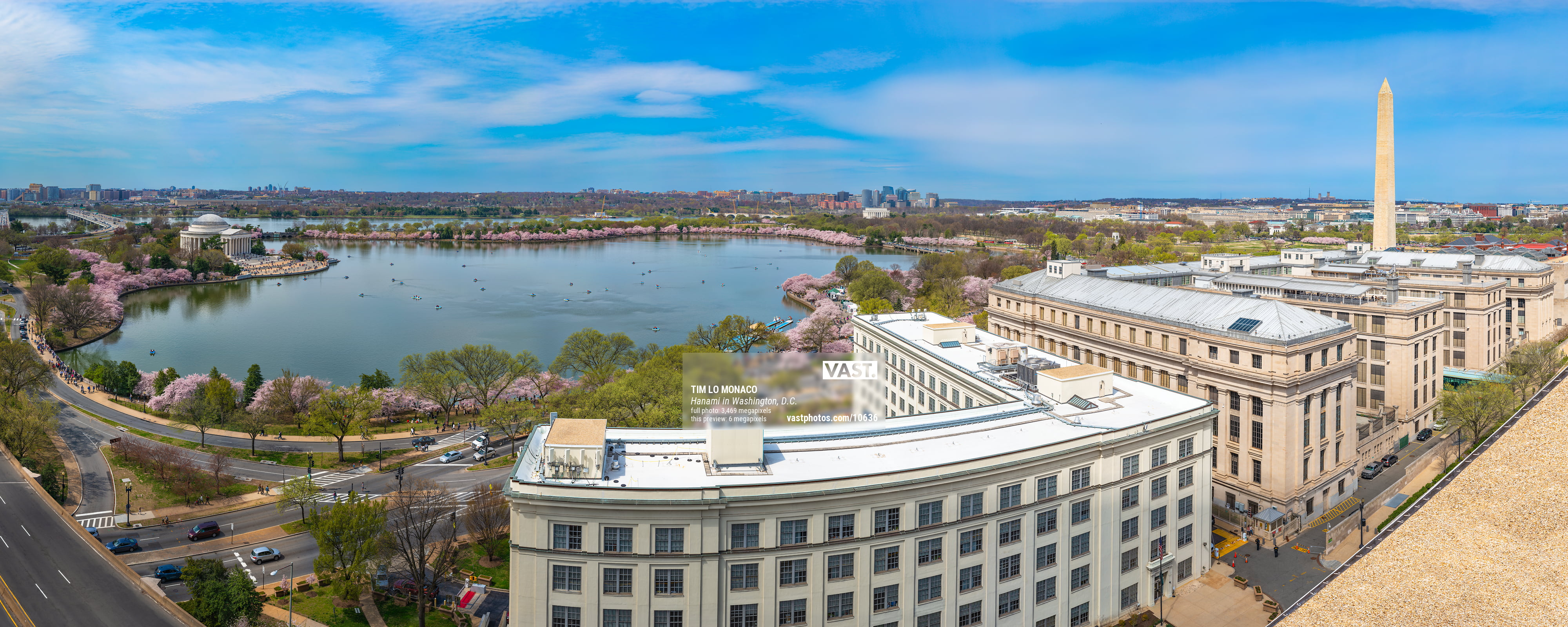 This high-resolution photo allows for making extremely large fine art prints and produces a hyper-realistic look unlike that of traditional fine art photography. It provides the viewer unrestricted access to the most intricate details of the many flowering cherry tree blossoms in their peak bloom and the nuances of the surrounding area. The trees guide the viewer along the Tidal Basin from the Thomas Jefferson Memorial to the Martin Luther King, Jr. Memorial. The viewer can also explore Arlington, Virginia, across the Potomac River, the Air Force Memorial, Pentagon, Arlington Cemetery, Rosslyn, Lincoln Memorial, Washington Monument, and the White House to name a few of the sites. It isn’t a surprise that myriad people from all over the world come to Washington, D.C. to enjoy the ephemeral beauty of the peak bloom of the Cherry Blossoms.