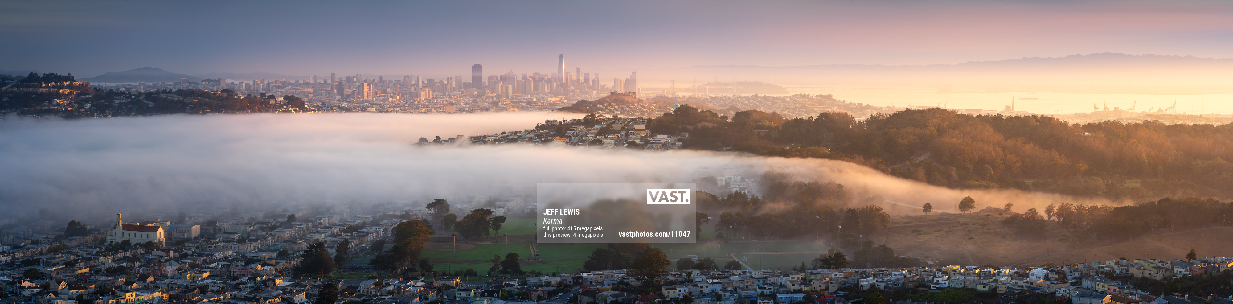 This VAST photo shows the San Francisco skyline, peeking out from behind its rolling hills and a blanket of fog, featuring neighborhoods that are rarely spotlighted in photos. As the sun rose, it bathed the scene in stunning golden light, which was the lighting I chose for this image. It needs to be seen large, and up close!