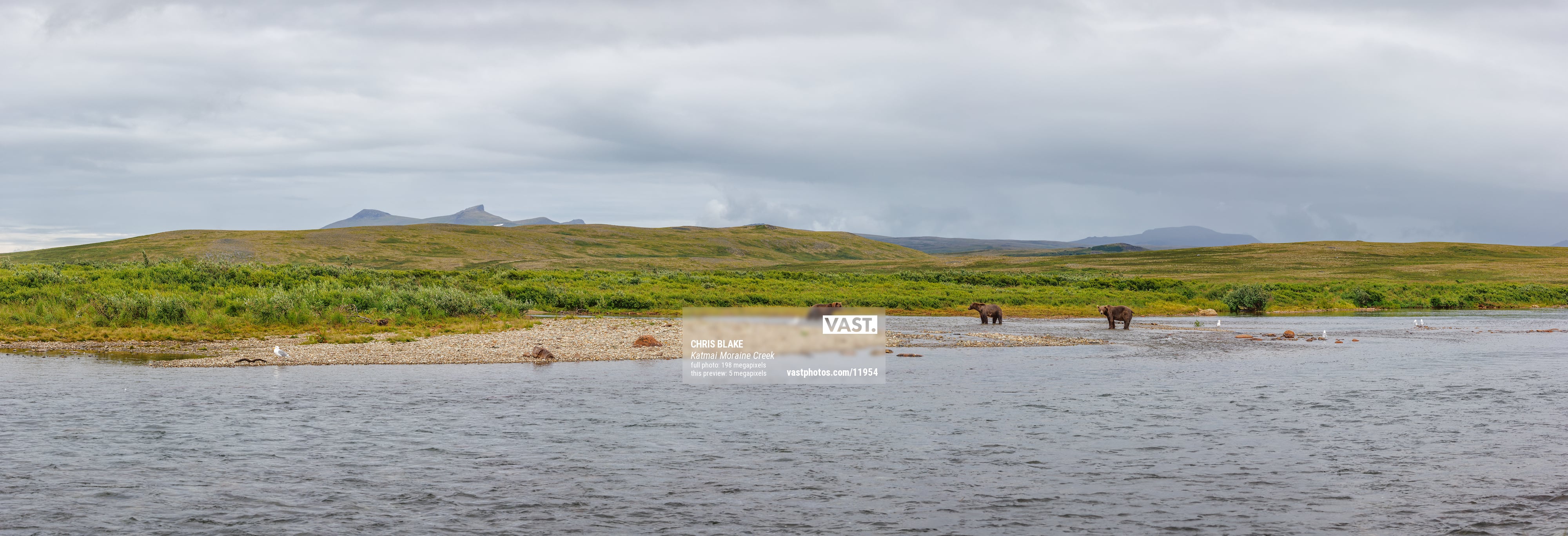 This expansive panorama, taken in the remote Crosswinds area of Katmai National Park, captures the peak of the salmon run in August, a time when the landscape bursts into a dynamic scene of wildlife activity.
