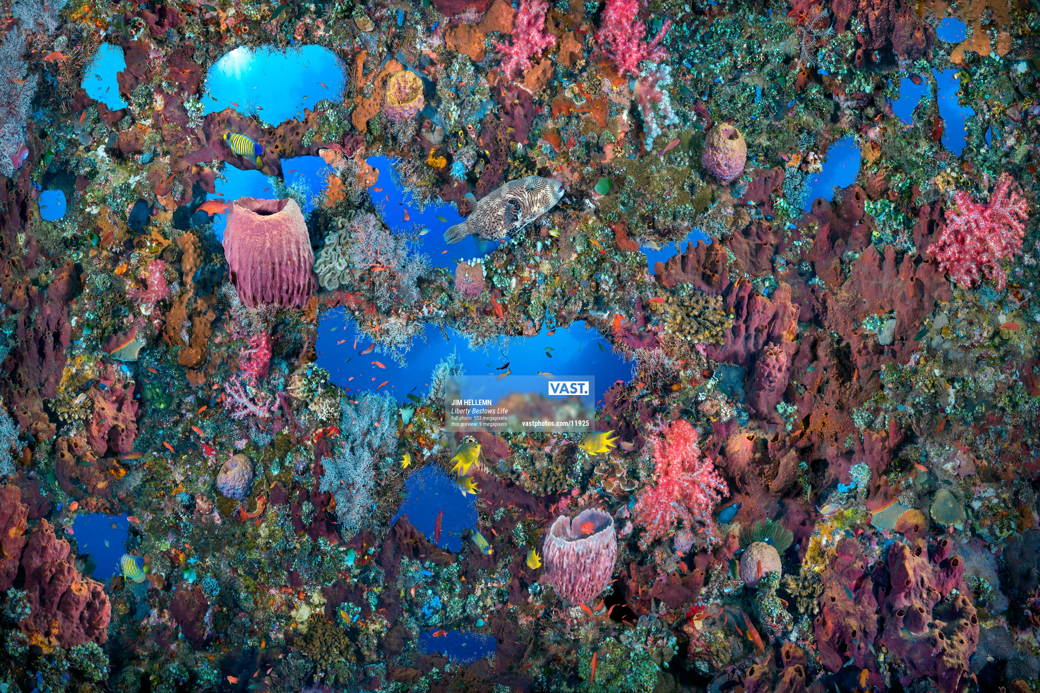 "Macro-mosaic" of the side of a decades old shipwreck in Tulamben, Bali, captured in multiple close-up images taken with a specialized camera platform. The sides of the ship are covered in marine life from the vivid hues of soft corals and barrel sponges to a variety of colorful reef fish. The hull of the ship, rusting away after many years underwater has created large holes, allowing a view of the reef behind and the sun shining through the clear water.