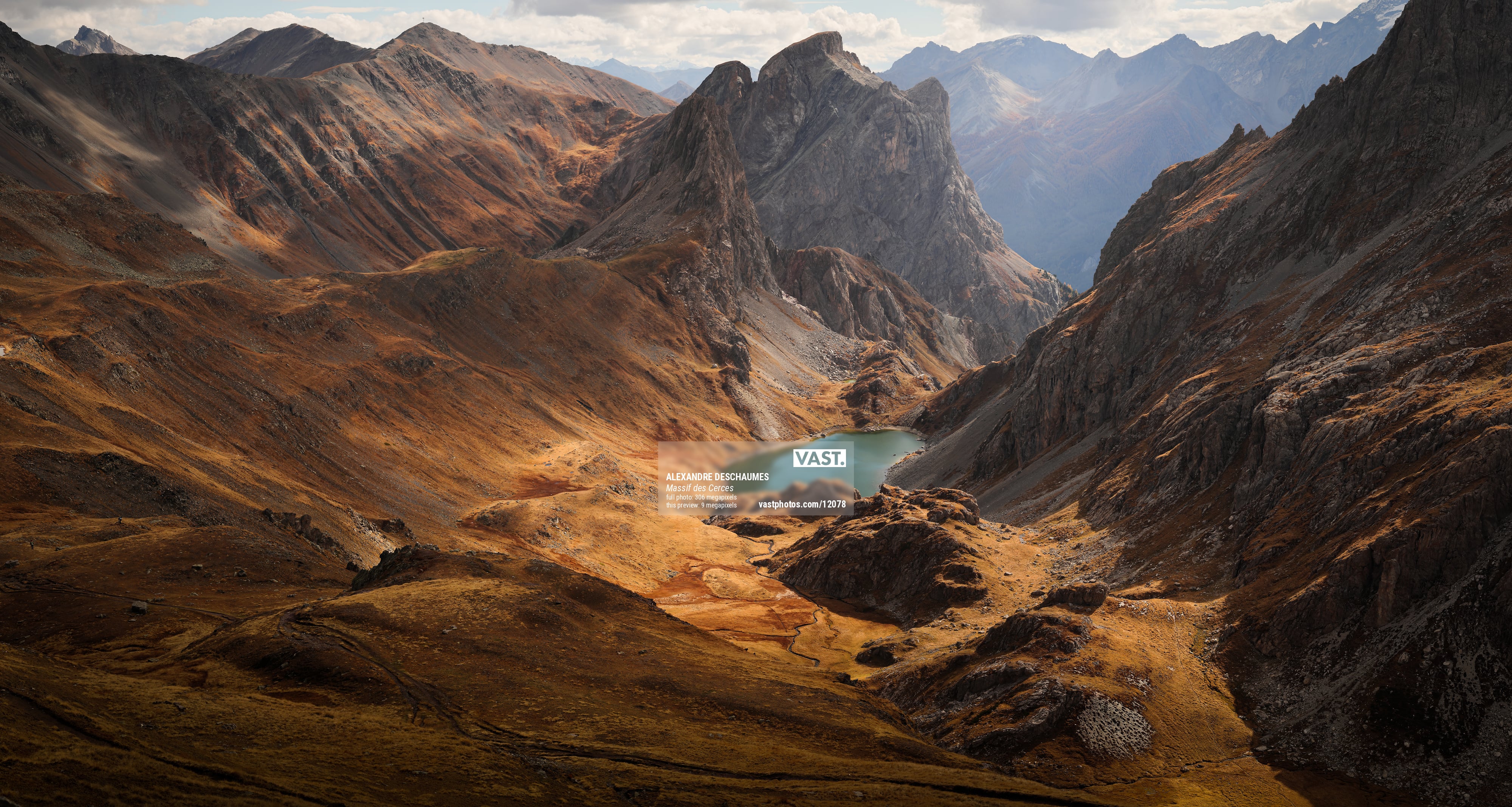 This panoramic photograph captures the Grand Lac de Monêtier, nestled beneath the towering Aiguilles de la Bruyère in the Hautes-Alpes. Taken along the Tour de la Pointe des Cerces, this scene embodies the raw and grandiose beauty of high-altitude landscapes. The vast mineral expanse, sculpted by time, is bathed in the warm hues of autumn, where golden grasslands contrast with the sharp, imposing rock formations.