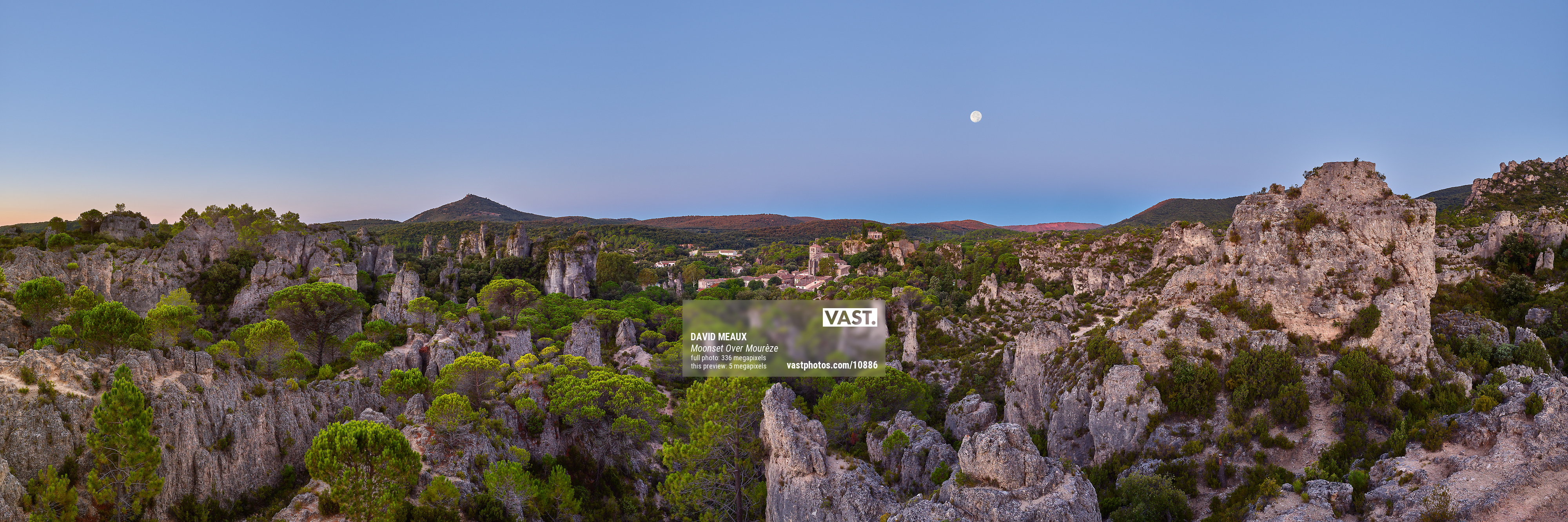 I arrived in Mourèze in the twilight hours before the crack of dawn. I picked up my backpack of gear and headed into the maze of dolomites in the dark, working my way toward the lookout point I had previously scouted out. Perched on a rocky spur atop a large dolomite, I set up my gear and adjusted the tilt, shift, non-parallax point, and precise focus settings of my medium format technical camera, using my headlamp to assist with the process. After getting the adjustments set, I began calculating the exposures I would need to capture the scene of the area surrounding the village of Mourèze as the sun began to illuminate it and the moon still in position.