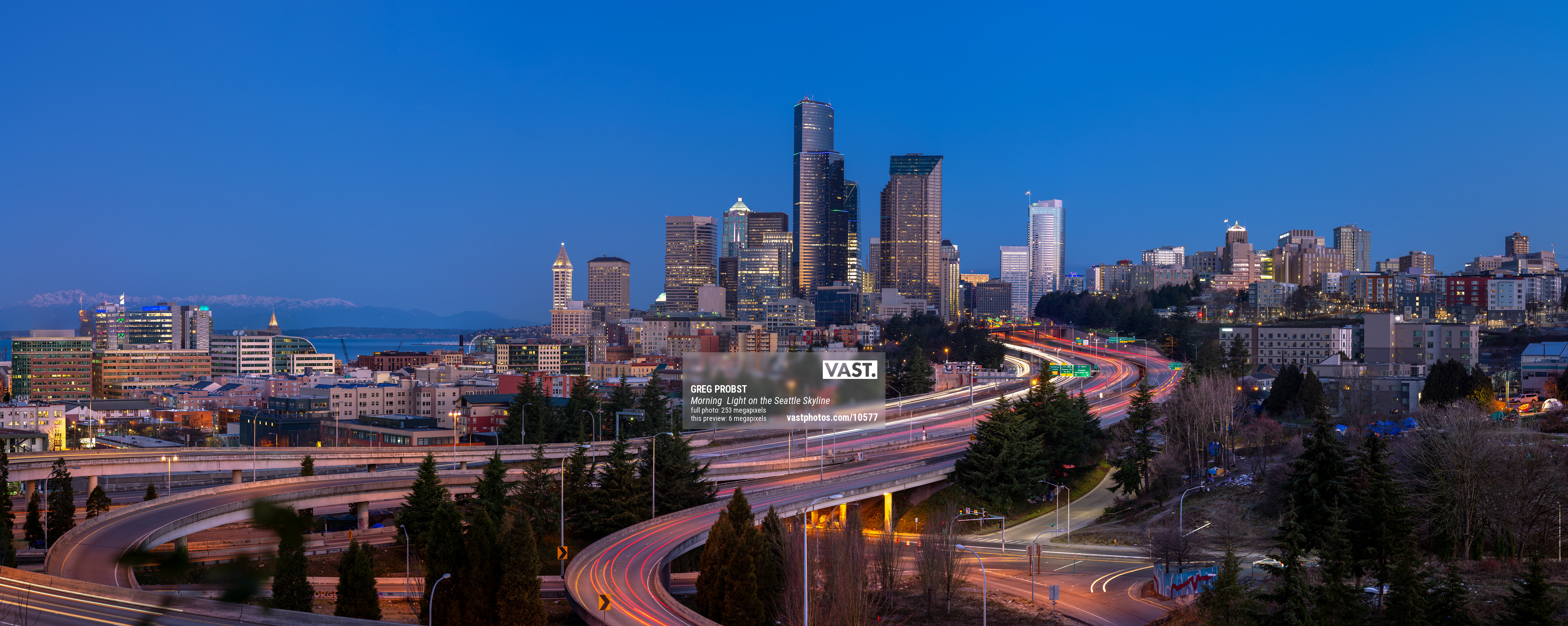 This view is from the south of downtown looking north and northwest with the snow covered Olympic Mountains across Puget Sound in the quiet light of dawn and the rush hour traffic of Interstate 5 and Interstate 90.