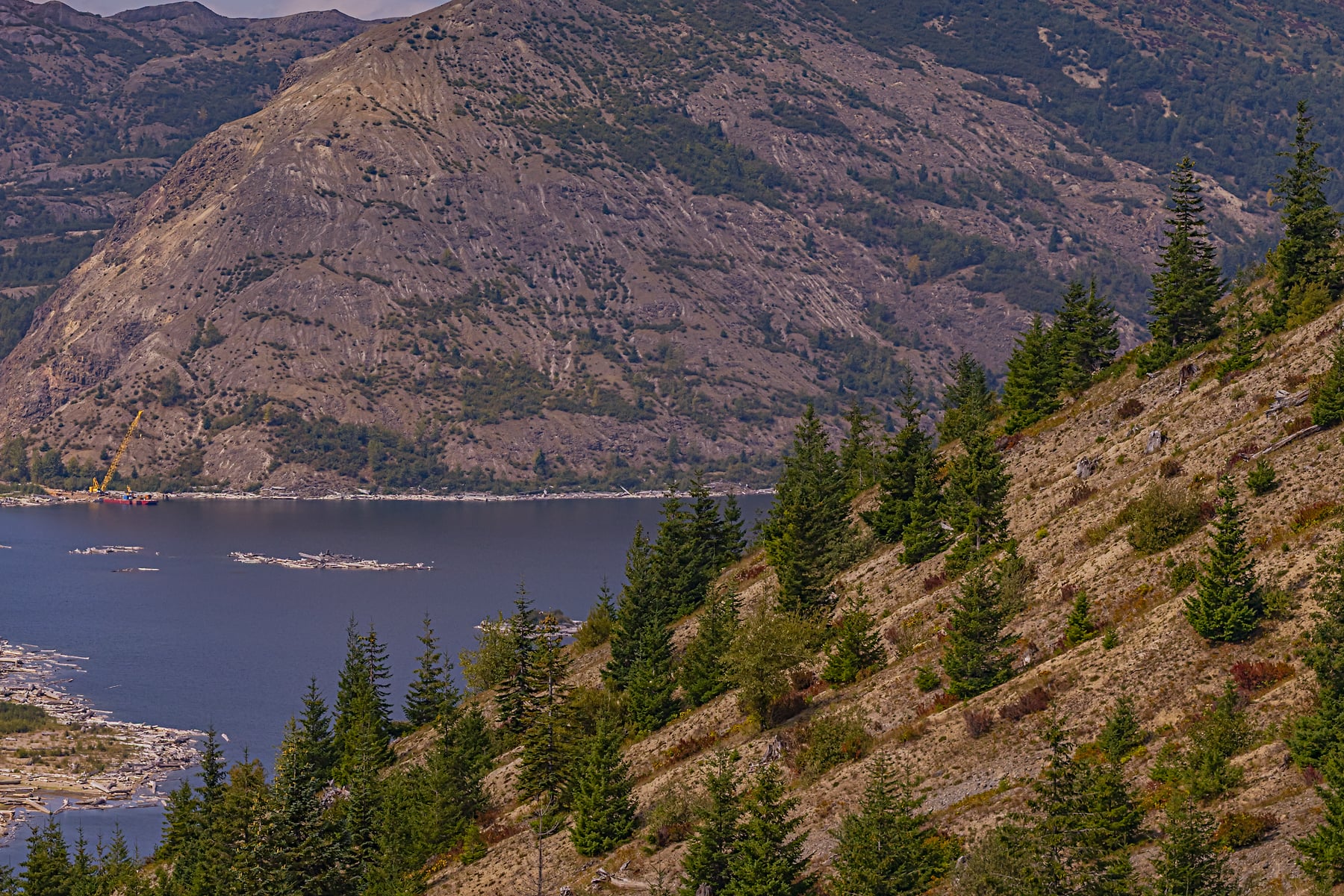 It's been 45 years since the volcano's 1980 eruption. Yet 45 years later the lake in the photo has numerous logs from the trees that were snapped like toothpicks when the mountain exploded.