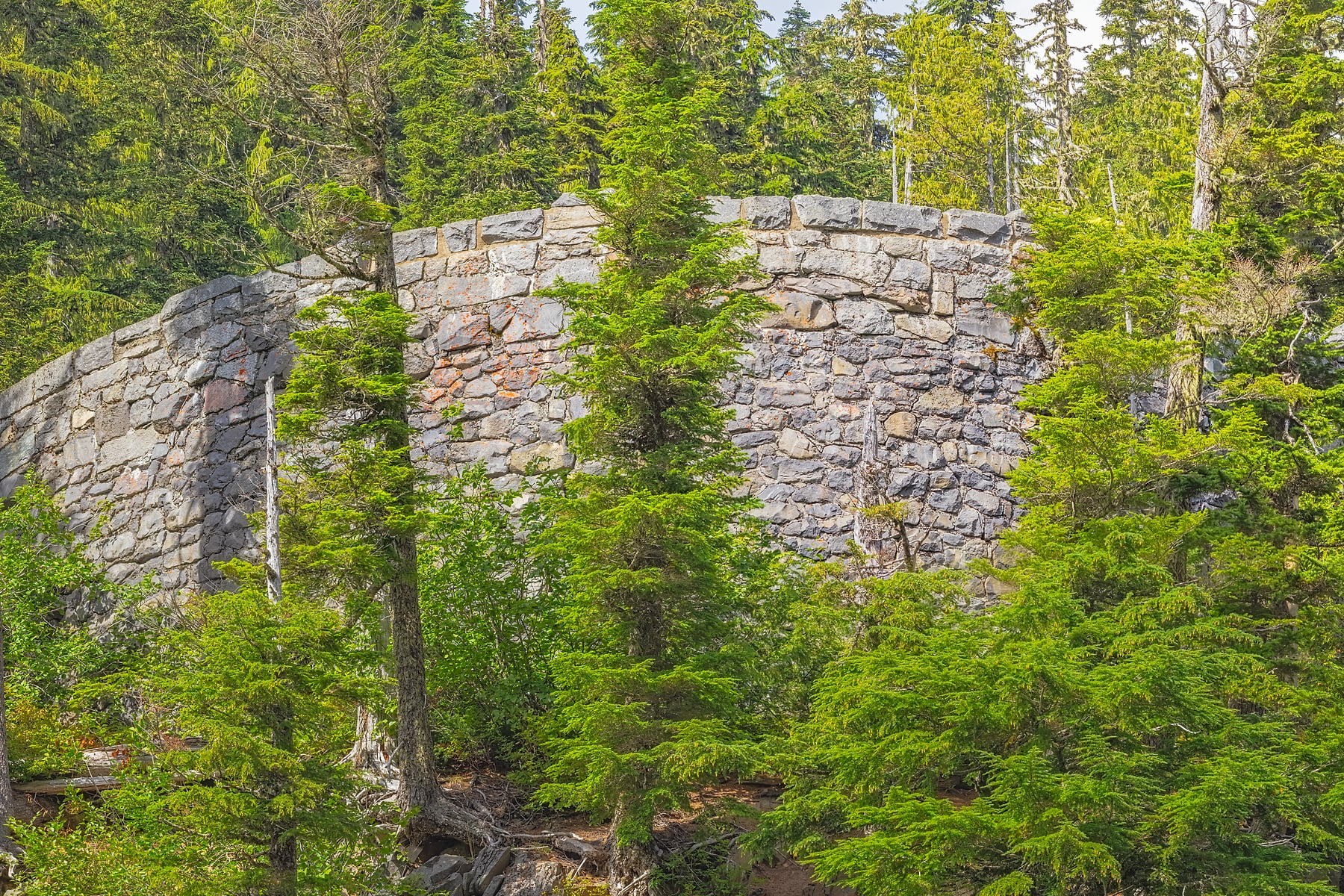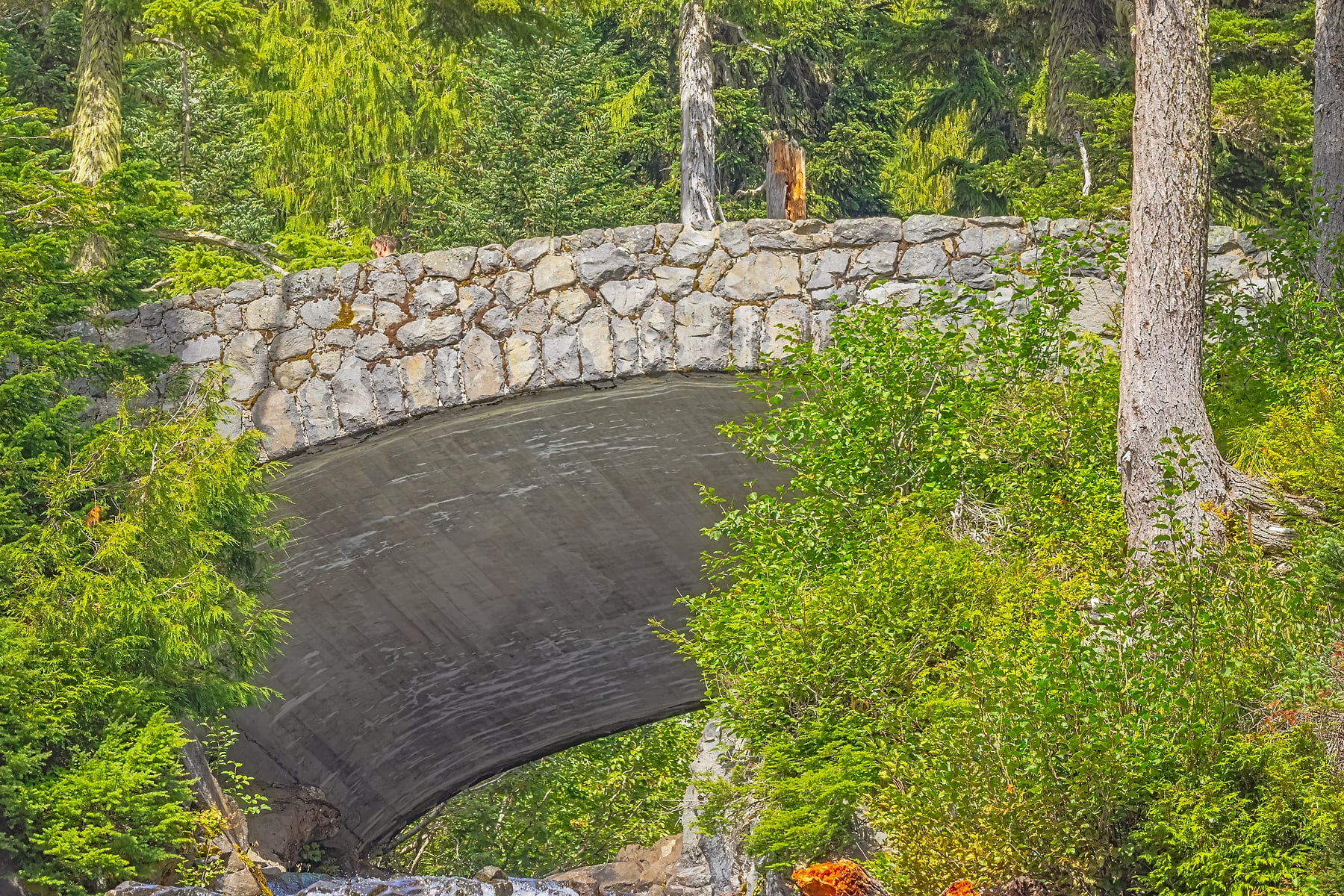 At the end of the short but steep trail, the entire 168-foot-high waterfall is visible. The vista is not only about dramatically falling water but also the rock that creates the steep drop. Here the Paradise River plunges over the edge of a relatively recent flow of hard Andesite lava that abuts much older rock. This lava’s cooling was accelerated by contact with the icy surface of the glacier that once filled this valley. The Paradise River runs clear, not milky, because it originates from snowfields, not debris-laden glaciers.