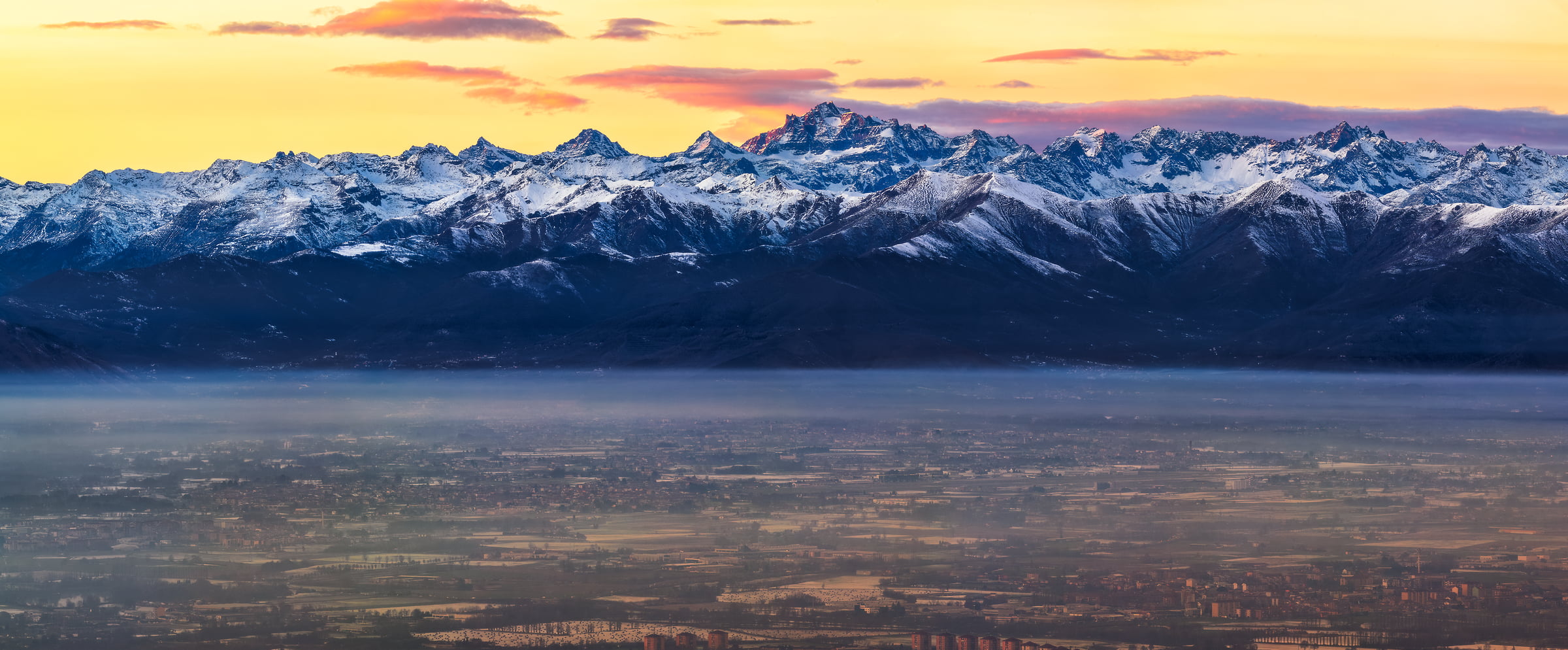 In this photo you can see the Gran Paradiso massif at sunset: under the mists and pollution cover the plain, while at high altitude the mountains are always clear with the snow falling on December 8, 2021