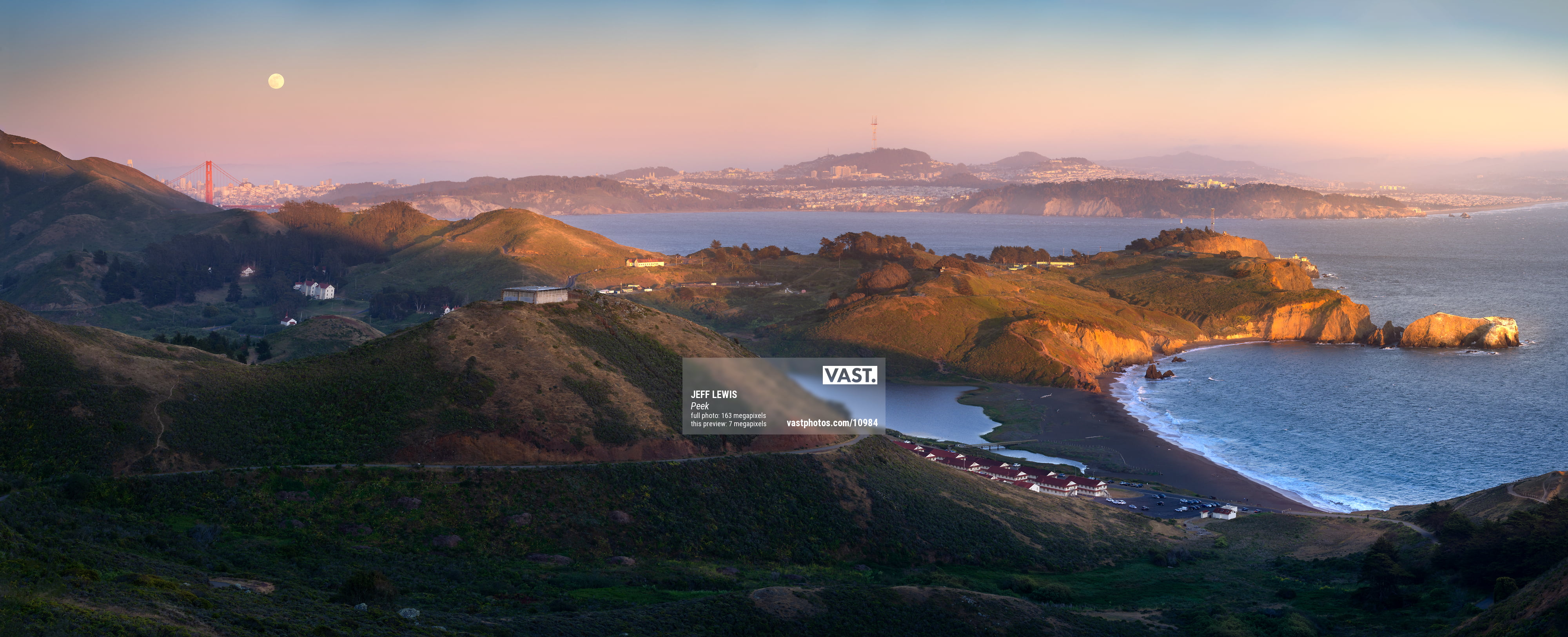 With a normal photo, this wouldn't amount to much, because there wouldn't be enough detail. But this is a VAST photo. You can enjoy the Golden Gate Bridge and each of its red cables, the individual buildings of the city skyline behind it, or peek into the trees and shrubs that cover the beautiful hills of southern Marin, or admire details in the dramatic sea cliffs. This scene was tailored for a large, detail-filled print, and you'll find yourself drawn to a different part of it every time!