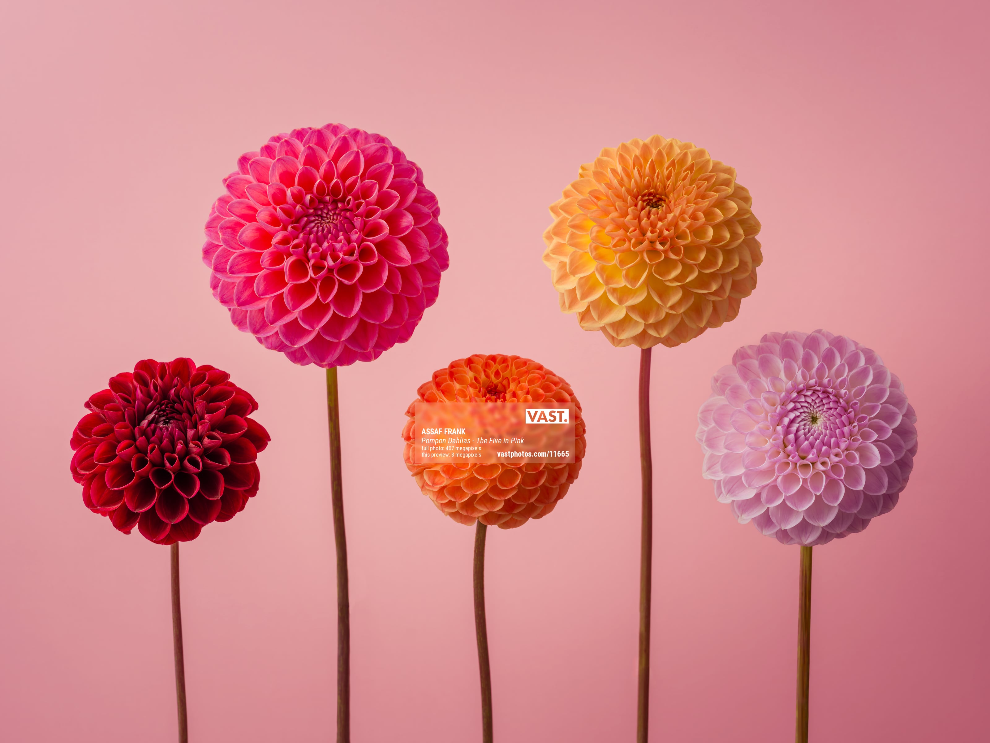 407 megapixels! A very high resolution, large-format VAST photo print of pompon flowers on a pink background; beautiful photograph created by Assaf Frank.
