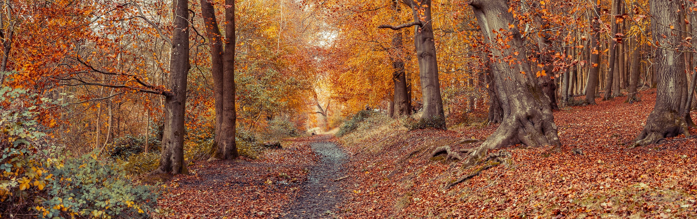 A peaceful woodland trail winds through a breathtaking autumn forest, surrounded by towering trees adorned in warm hues of orange, gold, and deep red. The soft path, lined with fallen leaves, meanders gently into the distance, inviting quiet exploration. The ancient trunks, with their textured bark and gnarled roots, add a sense of history and timelessness to the landscape. A delicate light filters through the canopy, casting a golden glow over the forest floor, creating an atmosphere of tranquility and reflection. The gentle curve of the trail disappears into the distance, evoking a sense of mystery and wonder.