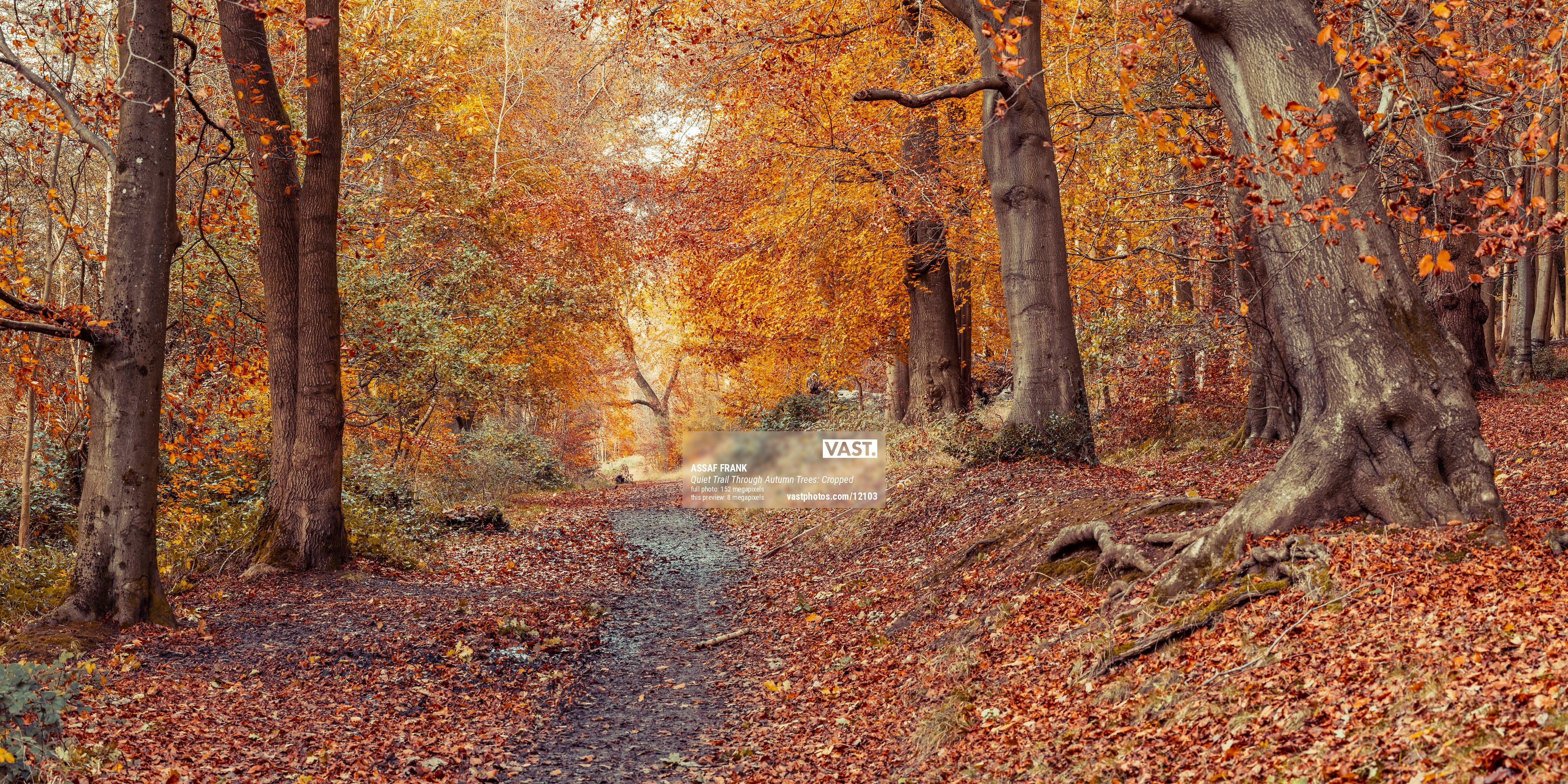 A peaceful woodland trail winds through a breathtaking autumn forest, surrounded by towering trees adorned in warm hues of orange, gold, and deep red. The soft path, lined with fallen leaves, meanders gently into the distance, inviting quiet exploration. The ancient trunks, with their textured bark and gnarled roots, add a sense of history and timelessness to the landscape. A delicate light filters through the canopy, casting a golden glow over the forest floor, creating an atmosphere of tranquility and reflection. The gentle curve of the trail disappears into the distance, evoking a sense of mystery and wonder.