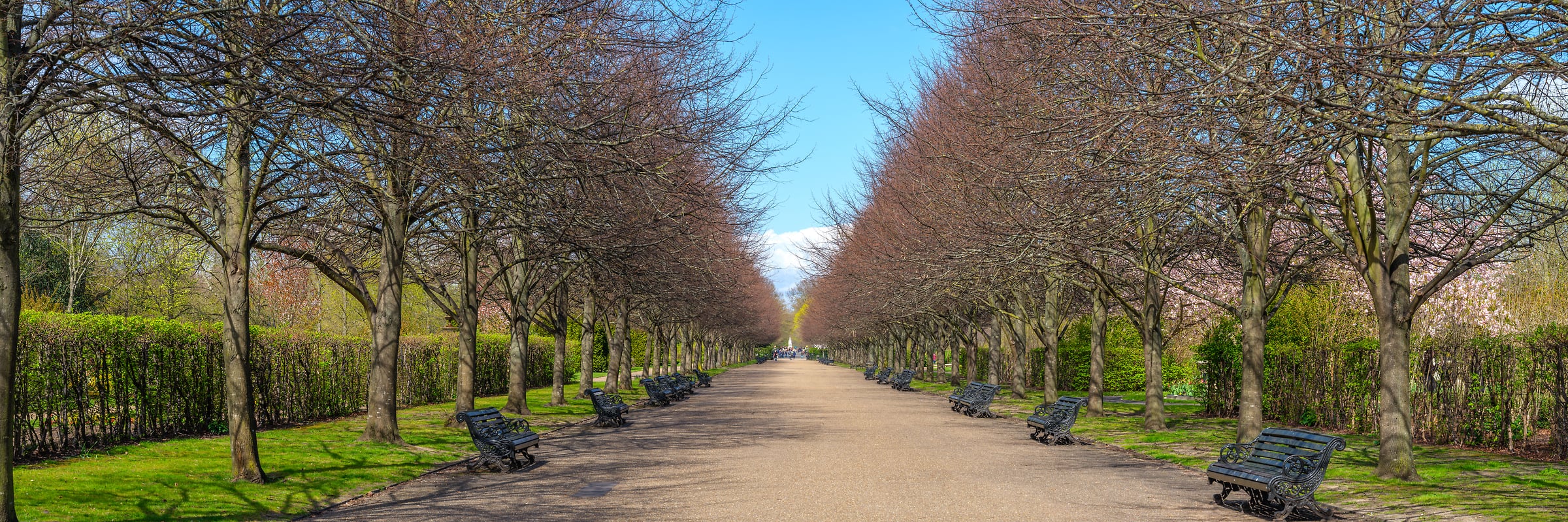 The image beautifully captures a serene pathway in Regent's Park, London, framed by a symmetrically aligned row of leafless trees. The path stretches into the distance, flanked on both sides by lush green hedges and well-maintained grass. Empty park benches line the walkway, inviting visitors to sit and enjoy the tranquil surroundings. The sky above is a clear blue, adding a touch of warmth and optimism to the early spring scene.