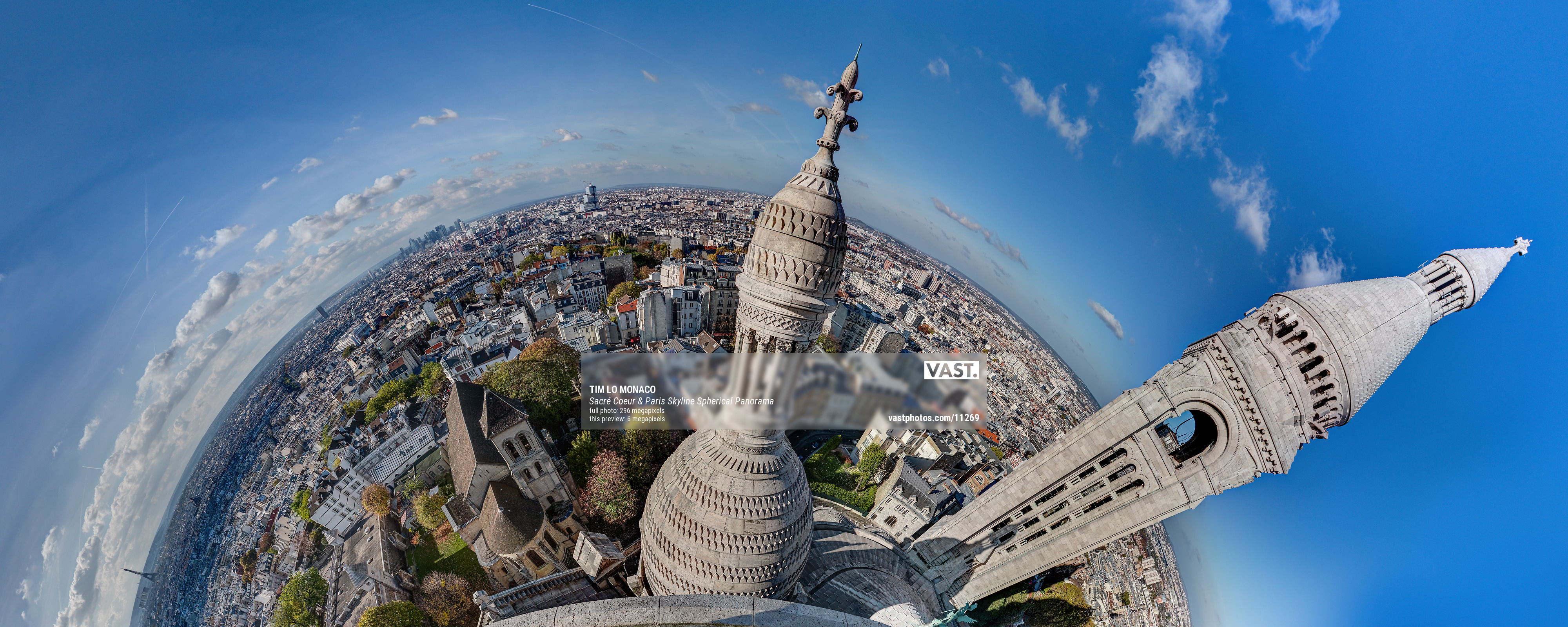Its vantage point makes it easily seen from most iconic sites in the city; especially any of the tall monuments and historic sites of Paris, such as the Arc de Triomphe, Notre Dame, or the Eiffel Tower. It sits bright atop the horizon as seen in my VAST Photo of the Paris skyline from Place d’Italie. Upon arrival, one must climb up the many stairs to get to the church, a small pilgrimage in itself. This basilica is simply beautiful, and its architecture feels unique, yet harmonious with other famous churches in Europe. It was hard to put my camera down with so many fascinating features. My wife and I were greeted with incredible panoramic views of Paris as we made the dizzying climb to the top of the dome. As I began to take photos of the cityscape, I decided to include everything I could see into a single photo. The entirety of the whole scene and its cohesive elements is what struck me the most.