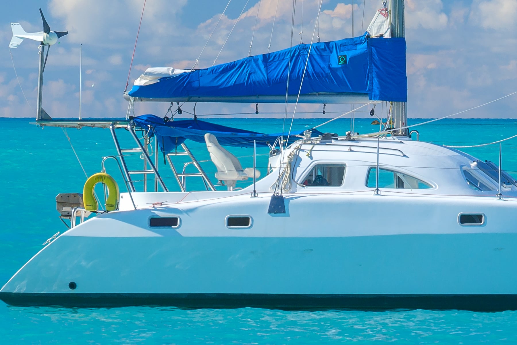 This panoramic photograph captures the stunning beauty of a tropical seascape, where vibrant turquoise waters stretch endlessly under a brilliant blue sky. Anchored peacefully on the serene ocean, a sleek sailboat with a blue canopy gently sways, embodying the essence of nautical leisure. The boat’s presence adds a charming focal point, inviting thoughts of relaxation and adventure.