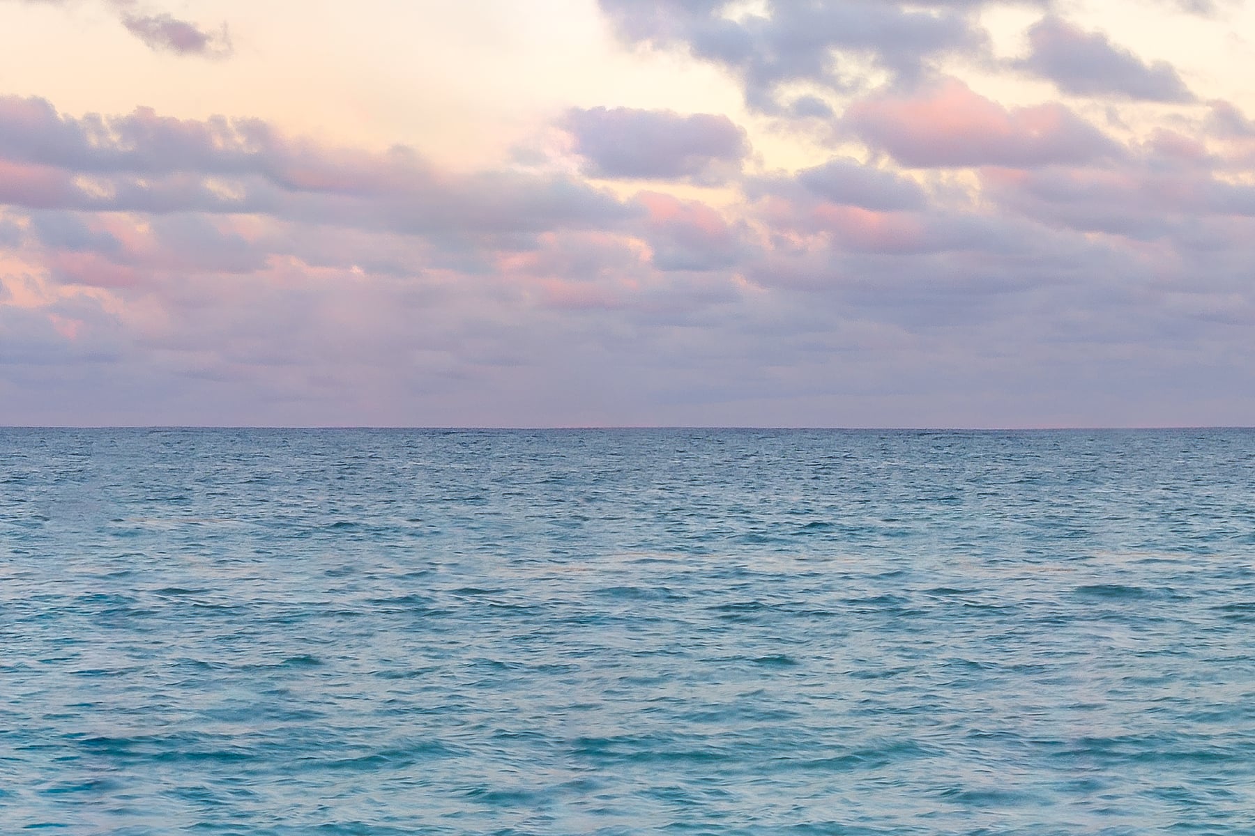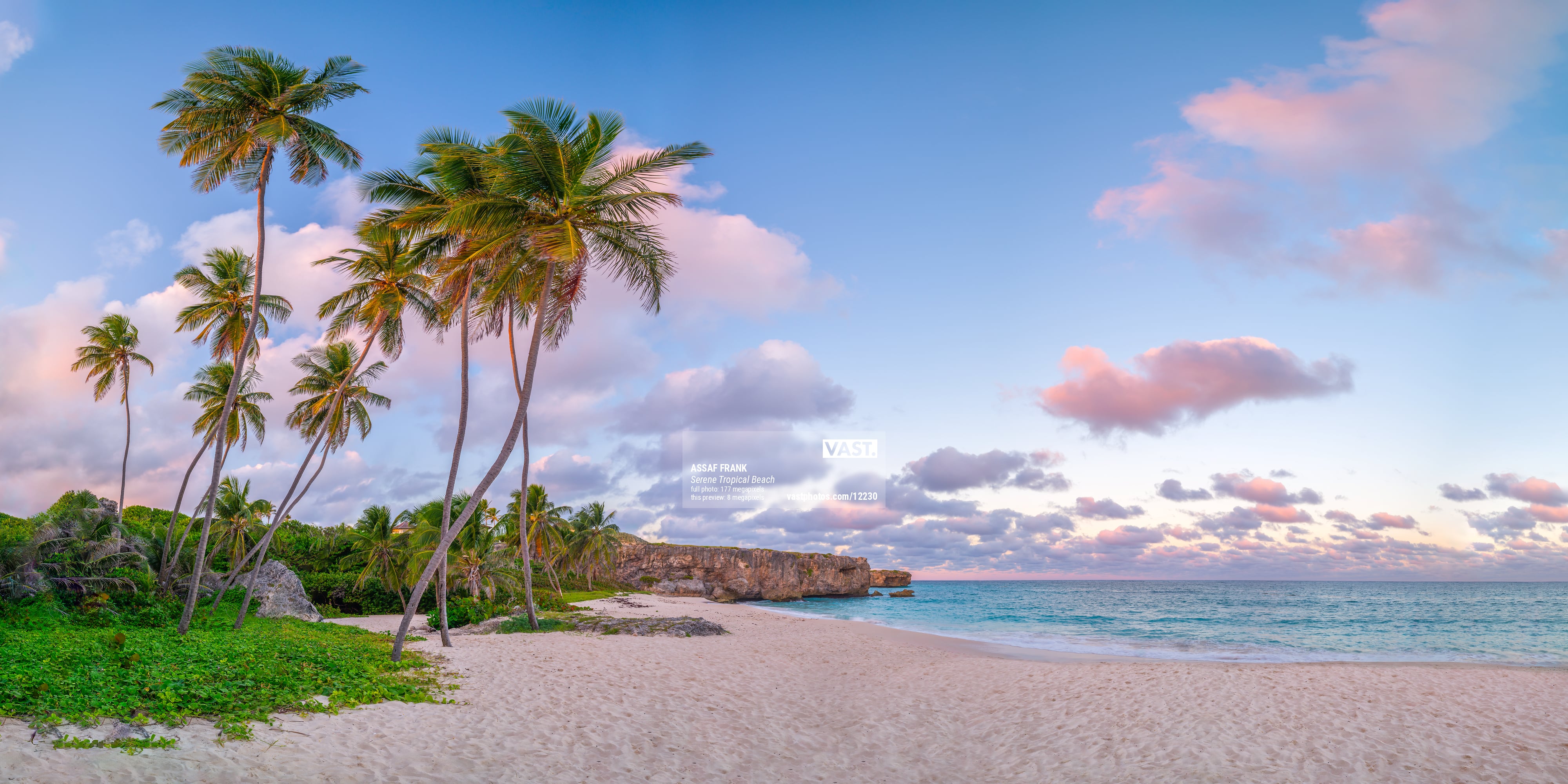 This stunning panoramic image captures a tranquil tropical beach at dusk in the Caribbean. Towering palm trees gently sway in the coastal breeze, casting long shadows over the soft, white sand. The sky is painted in pastel hues of pink, lavender, and blue as the sun sets behind the horizon, reflecting its colors across the calm turquoise waters. Puffy clouds drift lazily overhead, completing this idyllic seascape.