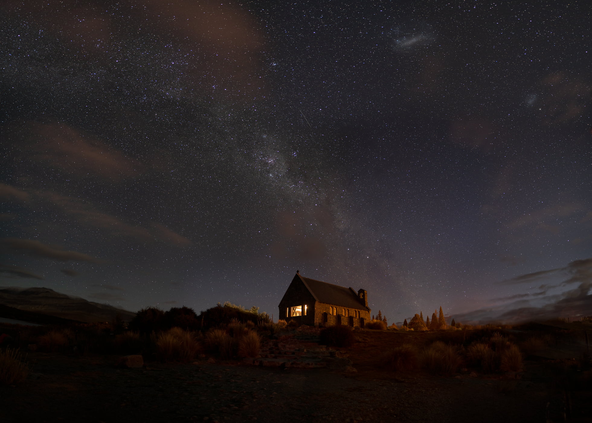 The Church of the Good Shepherd, situated on the shores of Lake Tekapo amongst the natural beauty of the lake and the mountains. The Lake Tekapo area is recognized as one of the darkest sky areas in the entire world, ideal for night photography