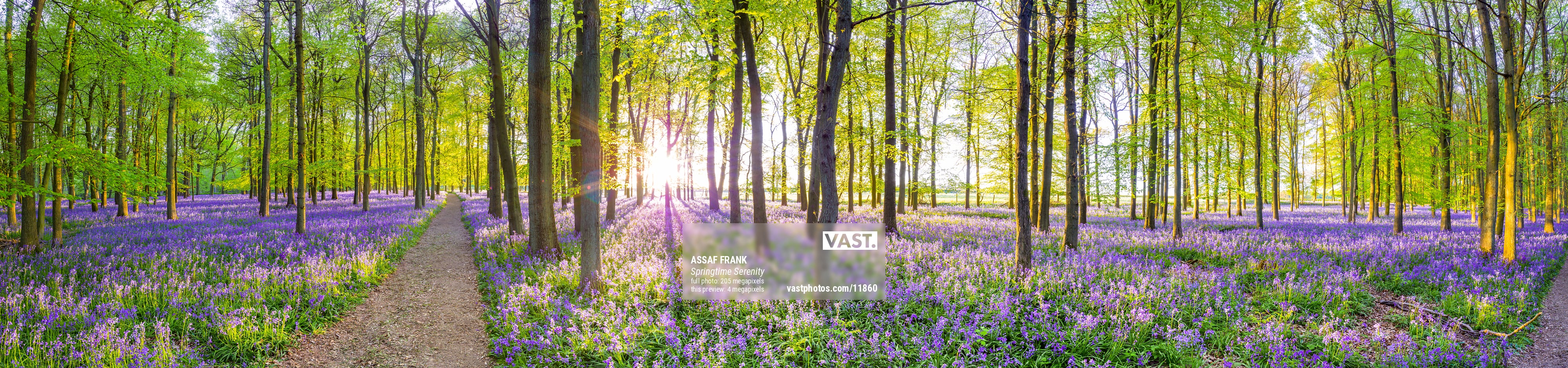 This stunning panoramic photograph captures the enchanting beauty of a bluebell forest with a pathway in Dockey Wood, Berkhamsted, during the height of spring. The forest floor is blanketed in vibrant bluebells, creating a breathtaking contrast with the fresh green foliage of the trees. The pathway meanders through this sea of blue and green, inviting viewers to imagine a serene walk amidst the blooming flowers.