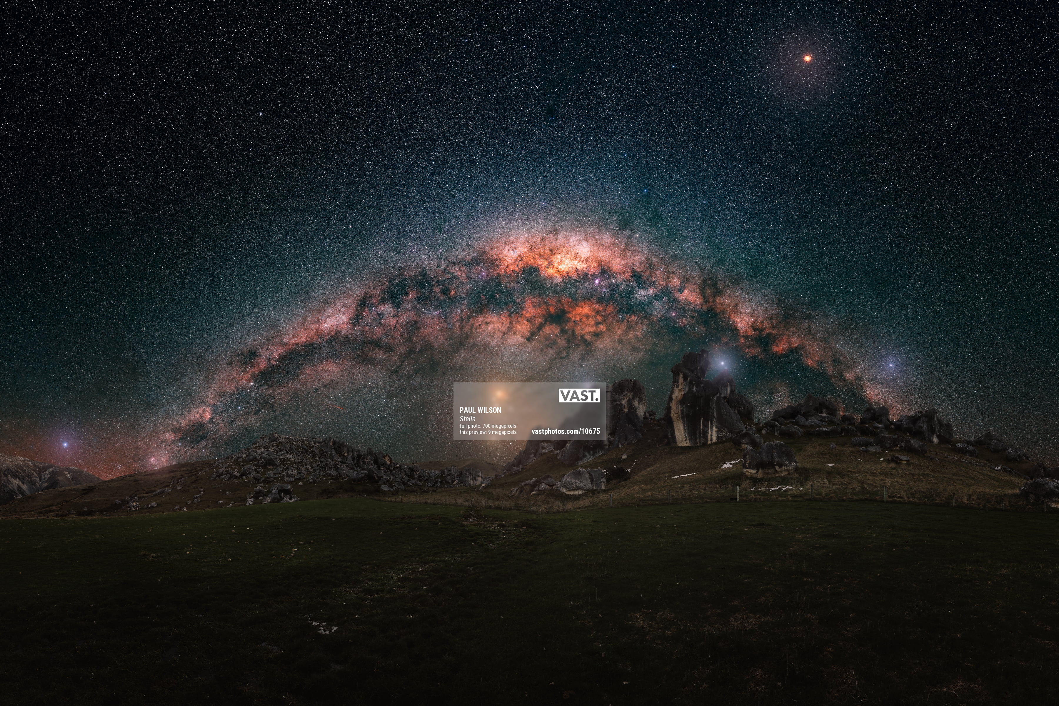 I shot the sky with the Fornax Lightrack II star tracker as a panorama with a 40% overlap, one minute each exposure. The milky way core was so bright and close to the horizon, it looked massive being so close to the landscape.