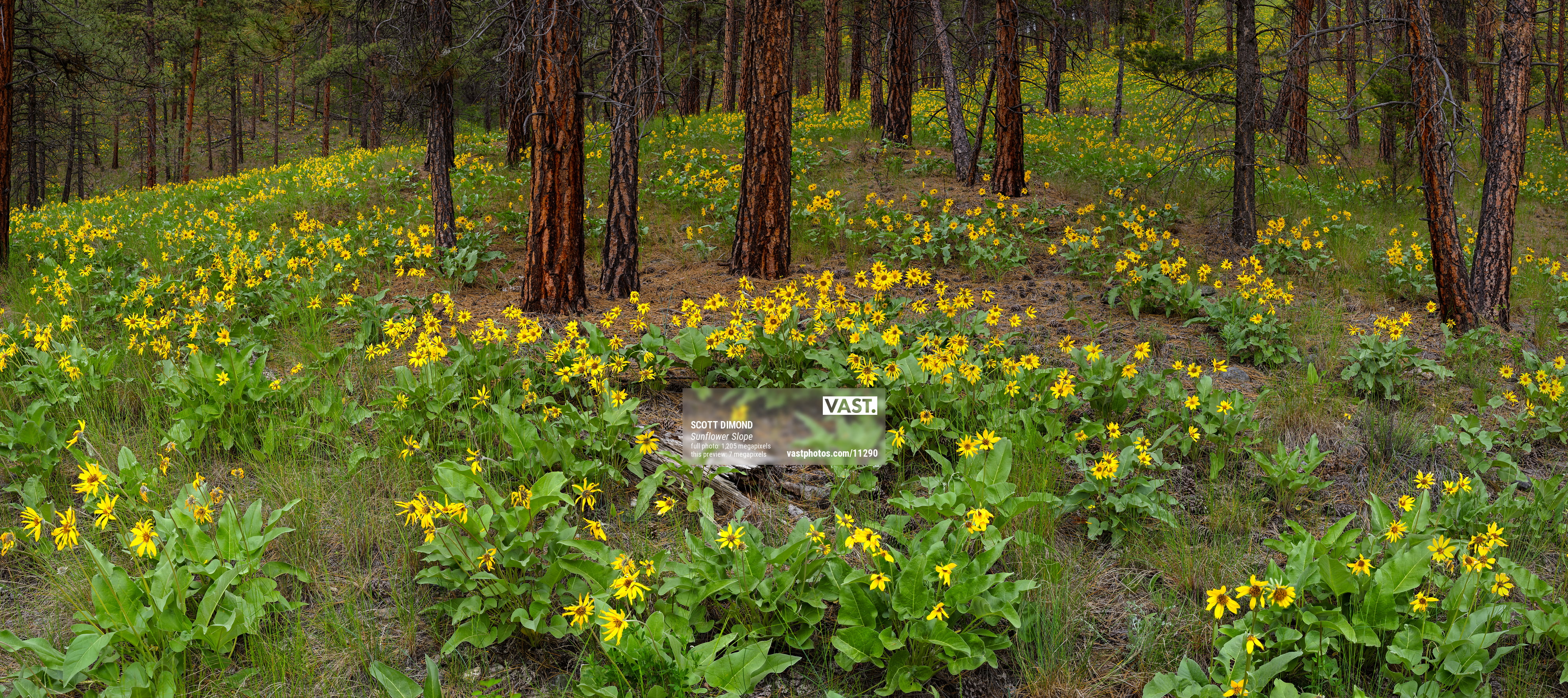 I often visit the area between the towns of Cranbrook and Kimberley in the East Kootenays and have seen large open fields blanketed with these sunflowers. But I have always been on the lookout for a large quantity of blooming flowers within an open ponderosa pine forest. That search was rewarded this past spring when I discovered this wonderful slope within a wooded area that was completely covered with blooming sunflowers. When I discovered this site there was a slight breeze and that immediately eliminated the possibility of creating an ultra-high-resolution image as the flowers danced gently in the wind. So, I had to return on a calmer day to set up the special equipment needed to create a VAST photo and worked quickly to capture the scene before any "flower dancing" resumed.