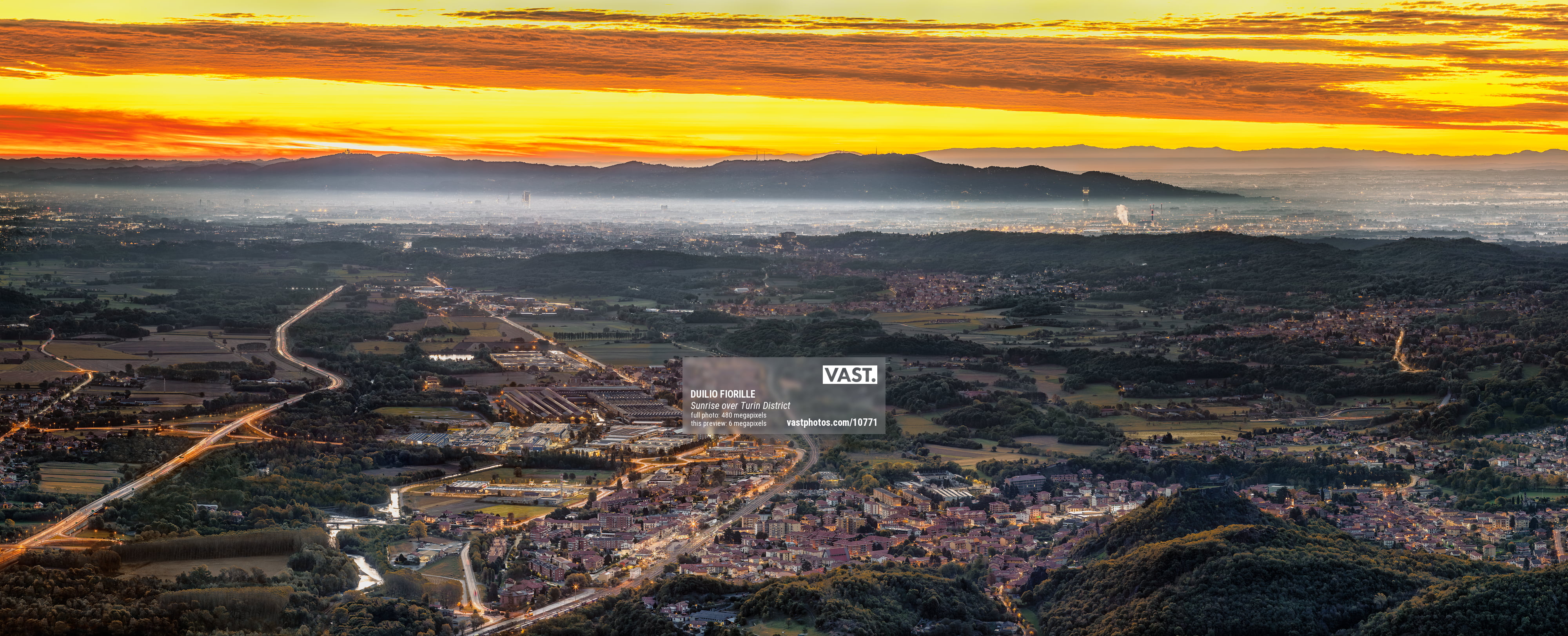 In the foreground, the City of Avigliana with its medieval fortress, now reduced to ruins, is clearly visible, while in the background the City of Turin (about 900,000 inhabitants) immersed in the morning fog is visible. The tallest buildings in the city stand out (the Mole Antonelliana, symbol of the city, the two recent skyscrapers and other important buildings).