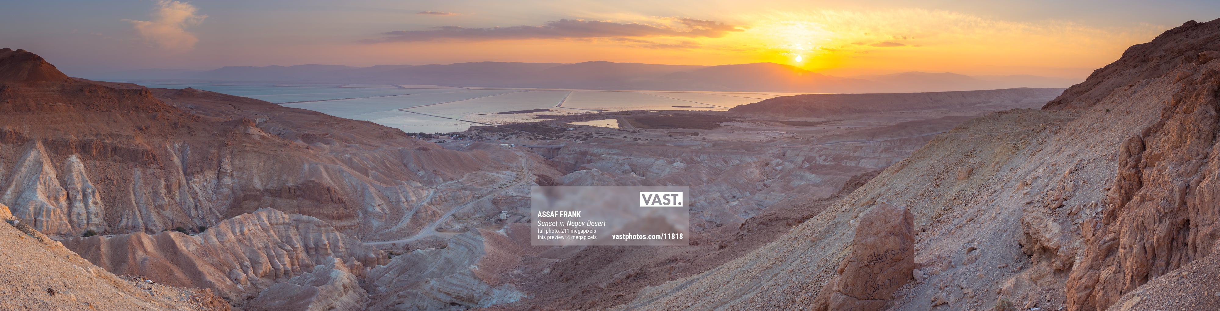 This panoramic photograph captures the breathtaking beauty of a sunset over the Negev Desert in Israel. The sun, descending behind the distant mountains, bathes the rugged desert landscape in a warm, golden light. The intricate patterns and textures of the rocky terrain are highlighted, creating a stunning contrast between light and shadow.
