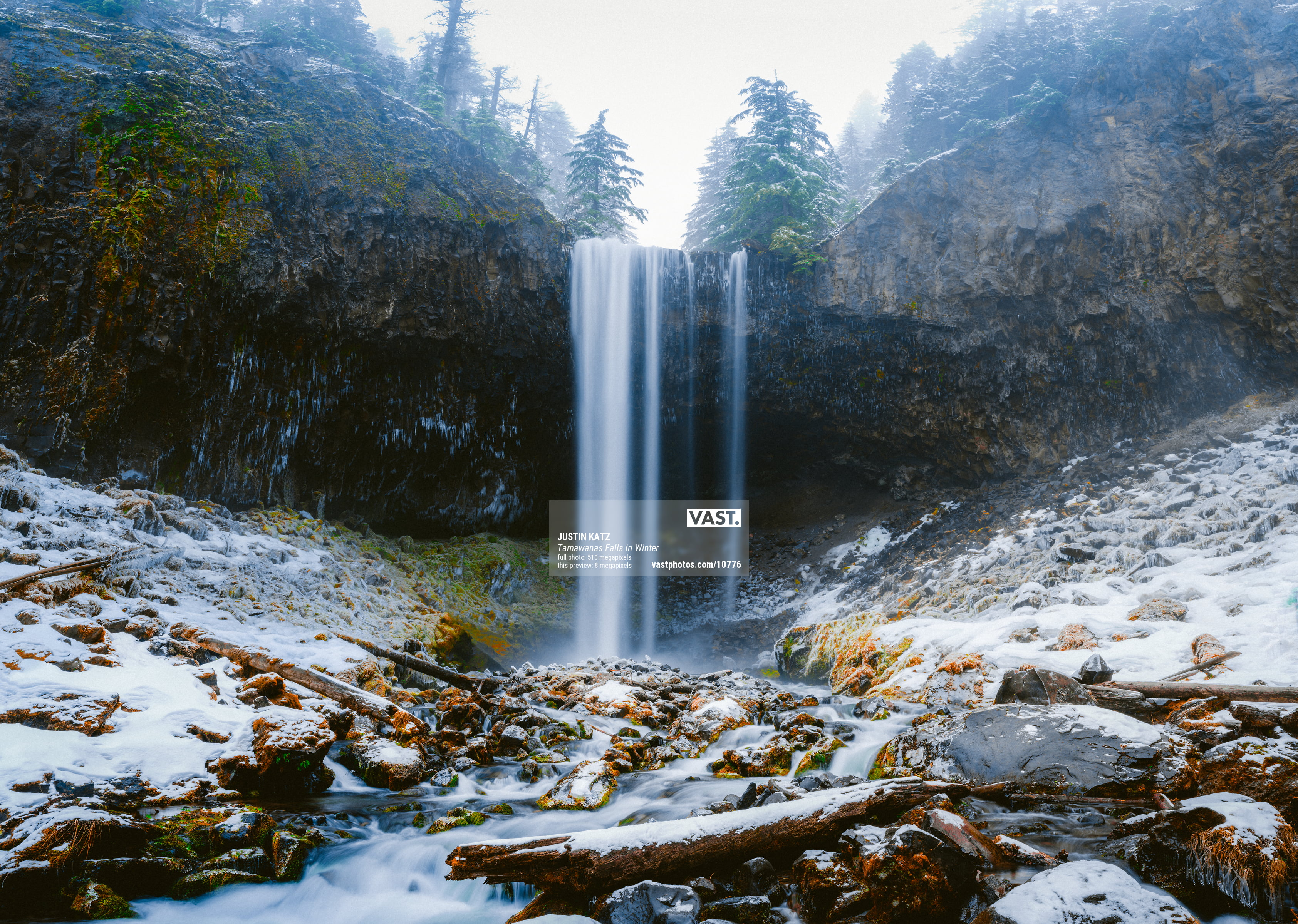 510 megapixels! A very high resolution, large-format VAST photo print of a snowy waterfall; photograph created by Justin Katz at Tamawanas Falls, Mount Hood, Oregon.