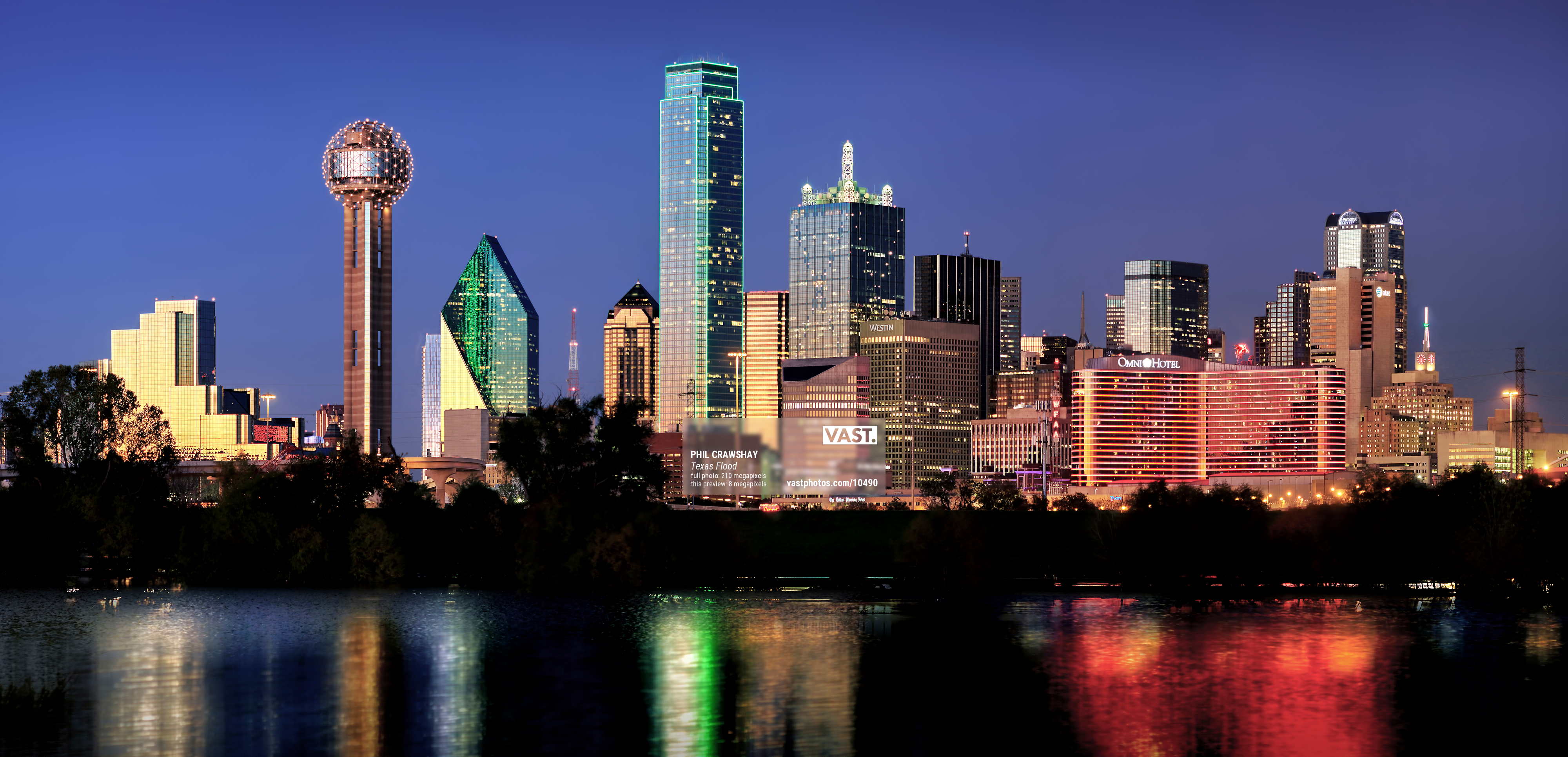 Iconic buildings such as the Reunion Tower and the Bank of America building can be seen reflecting in the water.