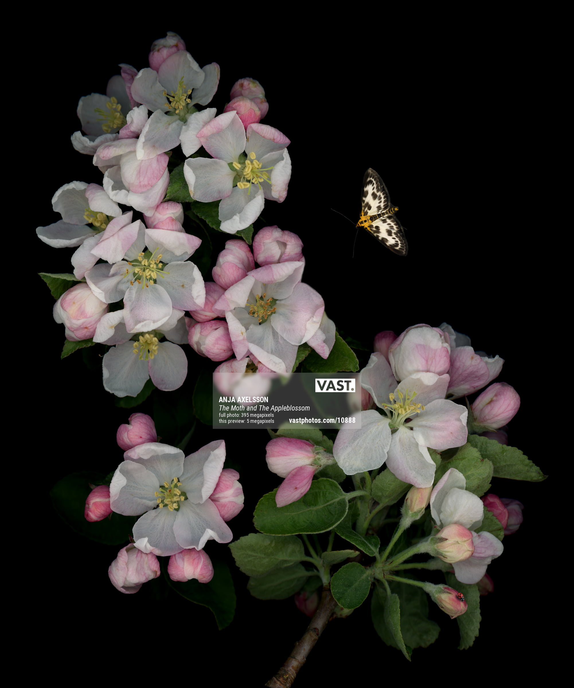 A multilayered botanical portrait of a singular moth fluttering above apple-blossom, at night.