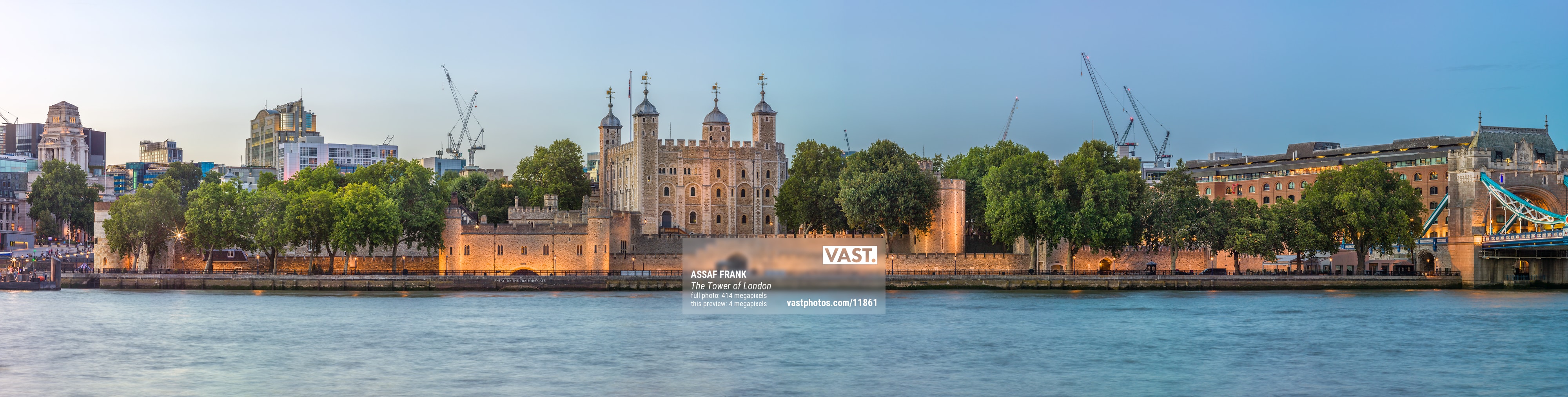 This panoramic photograph captures the historic Tower of London as it stands majestically along the banks of the Thames River. The scene is bathed in the soft evening light, highlighting this iconic fortress's ancient stone walls and towers. The trees surrounding the Tower add a touch of natural beauty, creating a striking contrast with the urban skyline in the background.