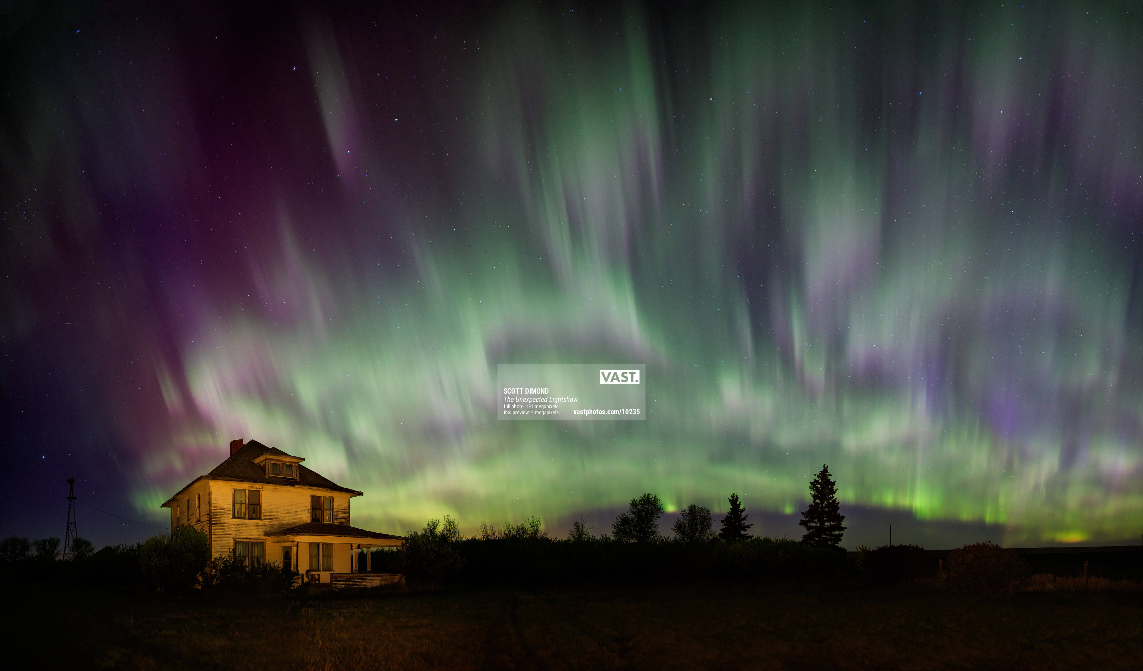 Once there, I grabbed the special equipment I needed to create a VAST photo and set it up in front. The lightshow did not disappoint; it was as active as any I have ever experienced. I used a flashlight to illuminate the old farmhouse and let the aurora take care of illuminating the sky with green and purple.