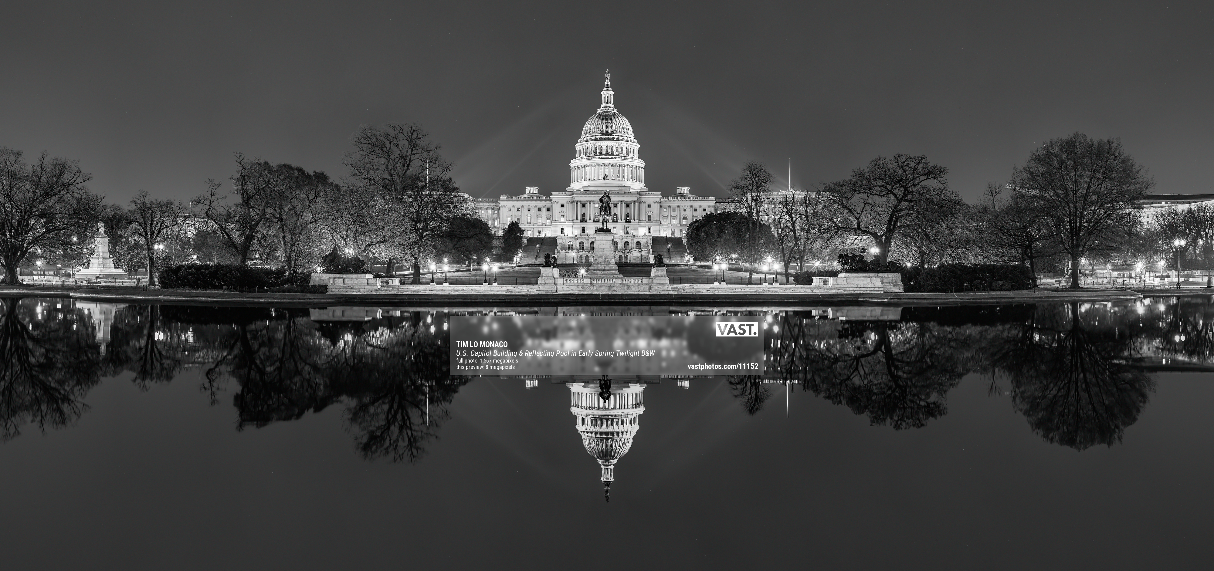 U.S. Capitol Building & Reflecting Pool in Early Spring Twilight B&W