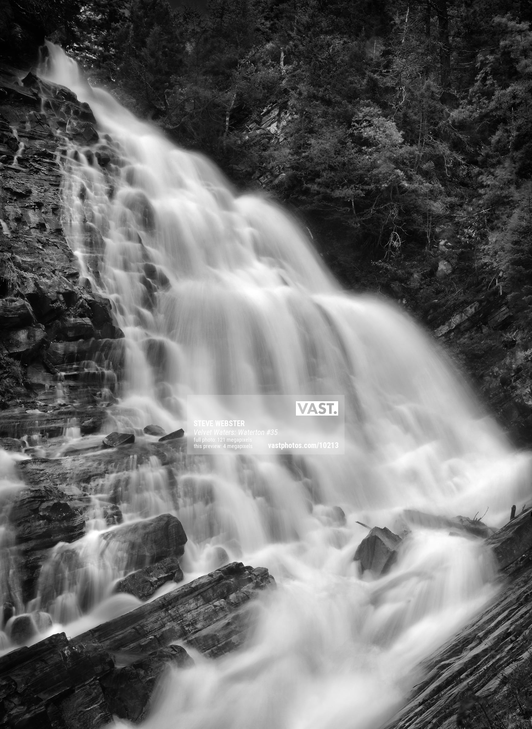 This image is part of a series of photographs I entitled “Velvet Waters”. Centered around rushing waters, this series of artworks is characterized by exceptionally deep black tonal qualities; the resulting B&W prints have an almost velvet like feel and texture as the deep blacks and pure white tones combine to give the viewer an experience they can almost reach out and touch. The image is made from over 20 detailed photos, which helps give the excellent, high resolution reproduction this waterfall deserves.