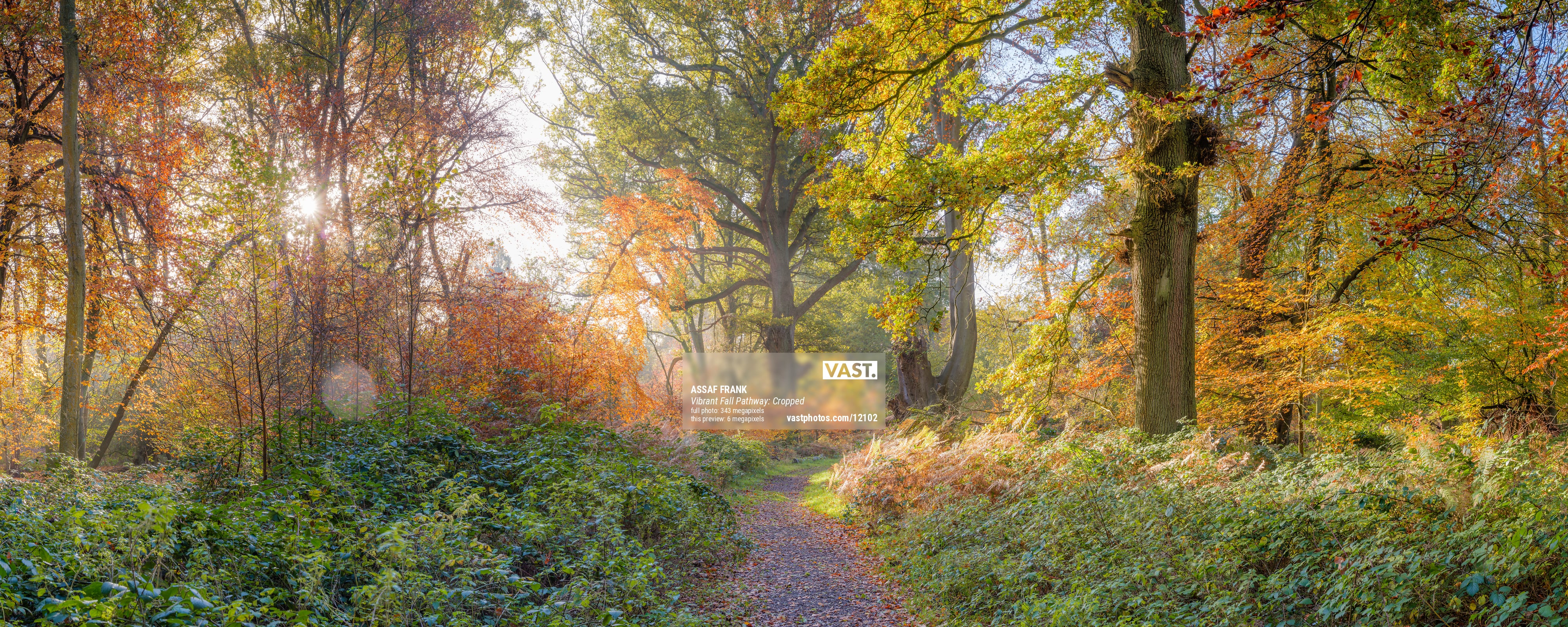 Pathway meanders through a breathtaking autumn forest, bathed in the golden hues of the season. The morning sun filters through the canopy of trees, casting dappled light across the lush greenery and fallen leaves that carpet the forest floor. The contrast of warm autumnal tones against the deep greens of late-season foliage creates an enchanting, almost magical ambiance, inviting visitors to take a peaceful walk through nature’s seasonal masterpiece.