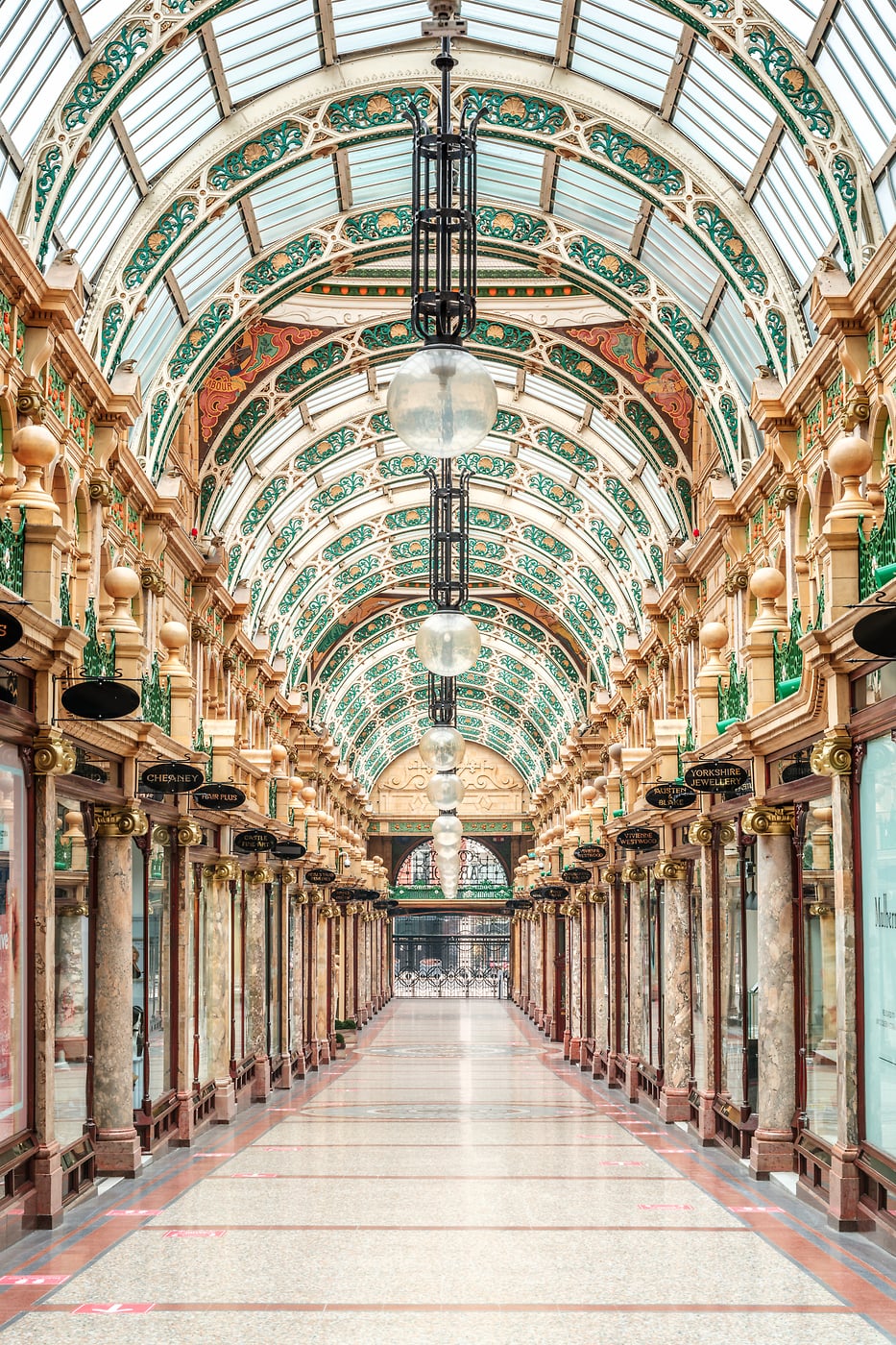 Victoria Leeds Shopping Arcade is an architectural masterpiece that beautifully blends historic elegance with modern retail luxury. The image showcases the stunning glass-vaulted ceiling adorned with intricate green and gold detailing, allowing natural light to cascade into the shopping corridor below. The symmetrical design of the arched ceiling creates a sense of grandeur, complemented by the ornate marble pillars and gold embellishments lining the walkways. The arcade exudes a timeless charm, making it not only a premier shopping destination but also a visual delight for visitors who appreciate historical architecture.