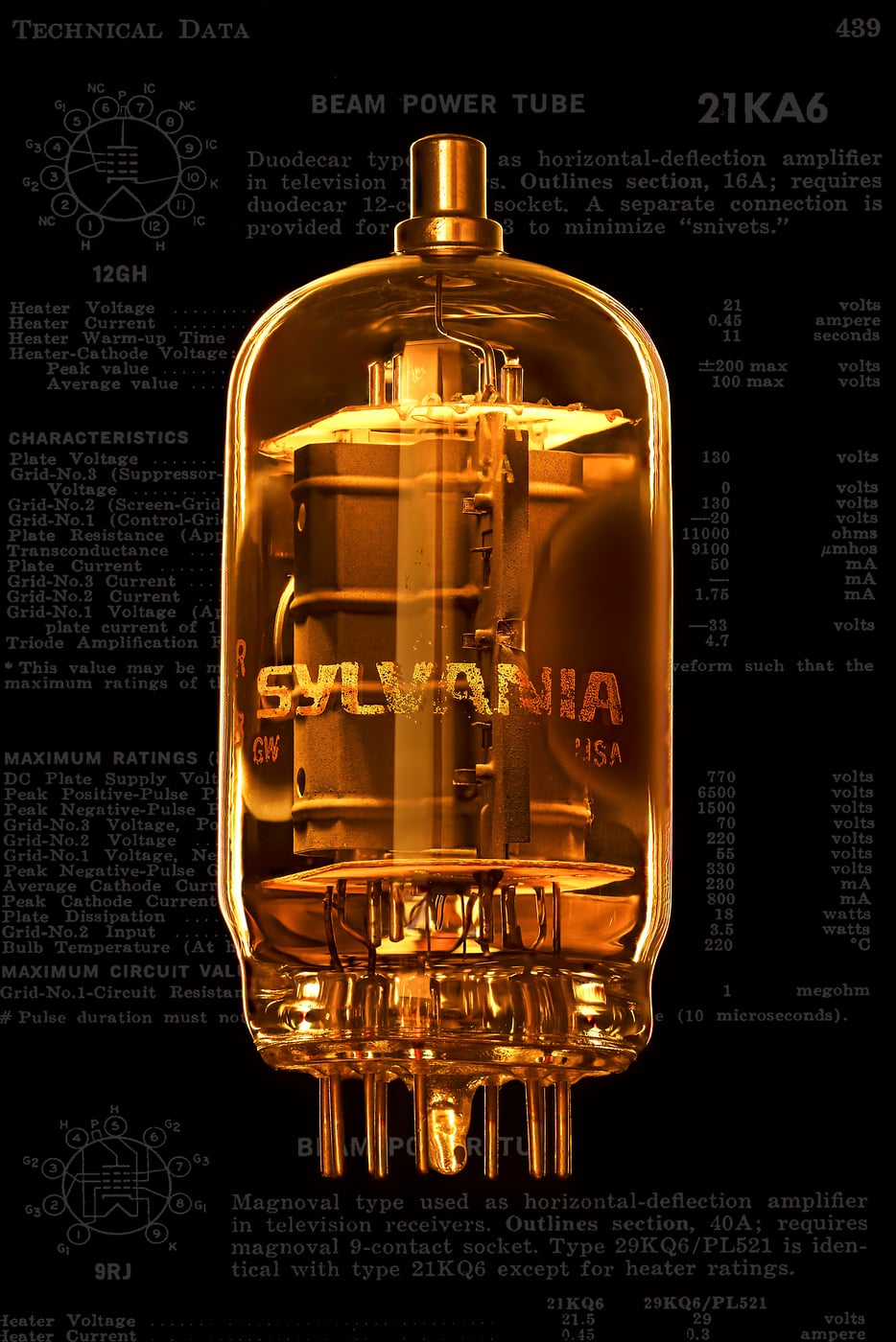 A close-up of "Vintage Vacuum Tube 21KA6 with Data Sheet" by Scott Dimond: an ultra-high-resolution VAST photo.