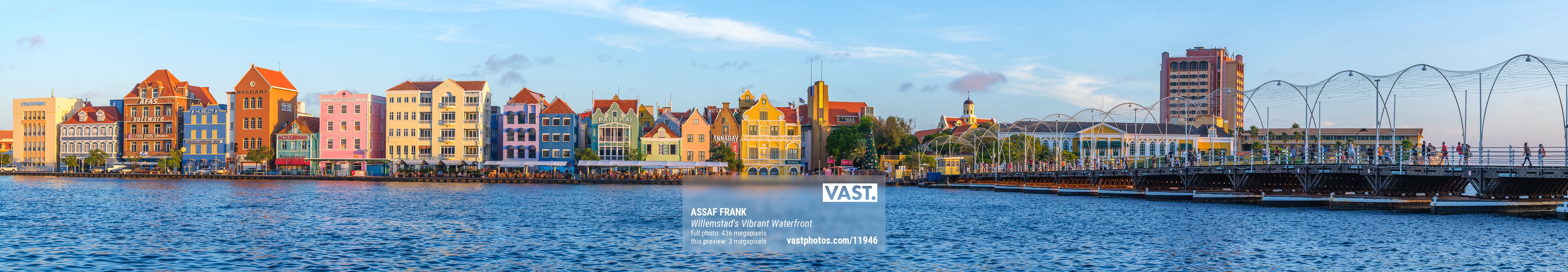 This breathtaking image captures the stunning waterfront of Willemstad, the capital city of Curaçao. Lined with brightly coloured Dutch colonial buildings, the vibrant architecture reflects off the tranquil waters of the harbour, creating a lively and picturesque scene. The palette of colors, ranging from warm yellows to cool blues and pinks, contrasts beautifully with the clear blue sky and shimmering water, offering a quintessential view of Caribbean charm and heritage. The iconic Queen Emma Bridge, an essential part of Willemstad’s charm, is visible on the right, linking the city's two halves.